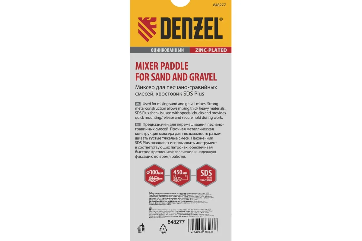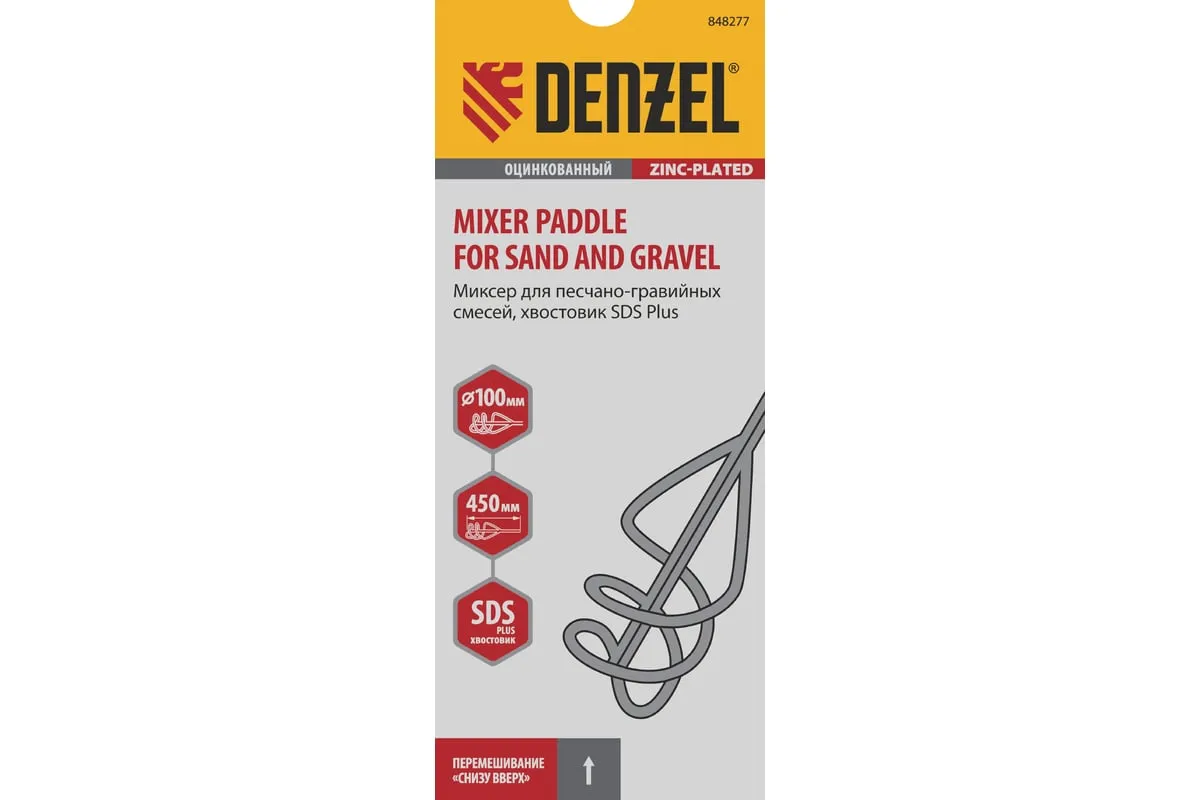 Оцинкованный миксер Denzel 848277, 100 х 450 мм, с хвостовиком SDS Plus, используется во время строительства и ремонта для перемешивания песчано-гравийных и других тяжелых смесей. Вращающаяся спираль движется по часовой стрелке, поднимая тяжелые частицы вверх и придавая однородность размешиваемому составу. Благодаря прочной сварной конструкции насадка не деформируется, перемешивая густые смеси. Миксер SDS Plus совместим с перфораторами средней и высокой мощности.