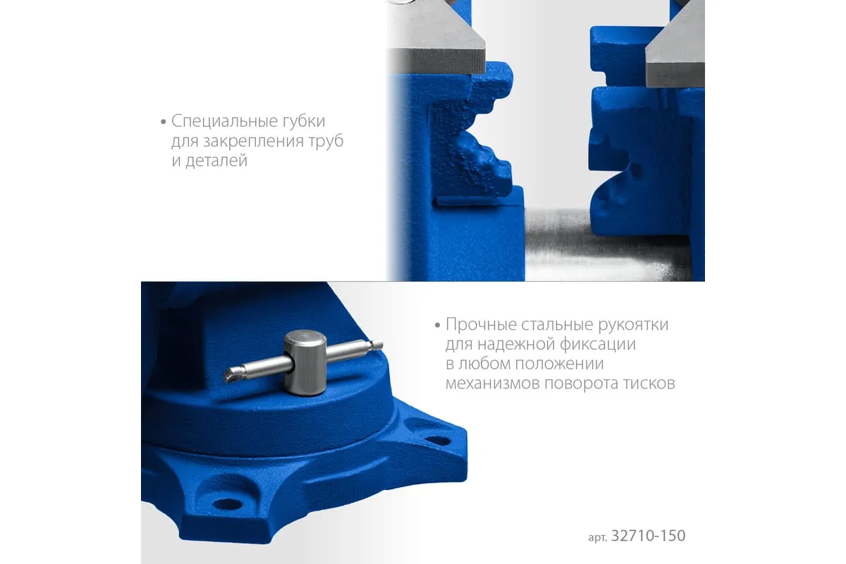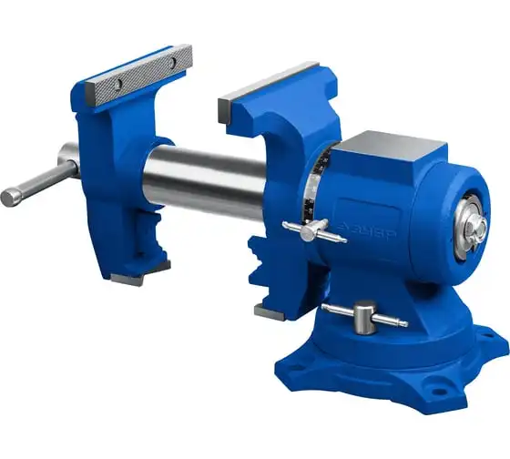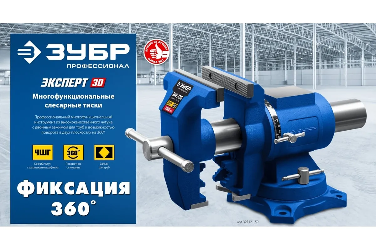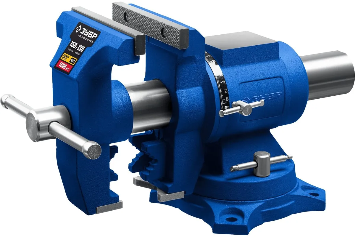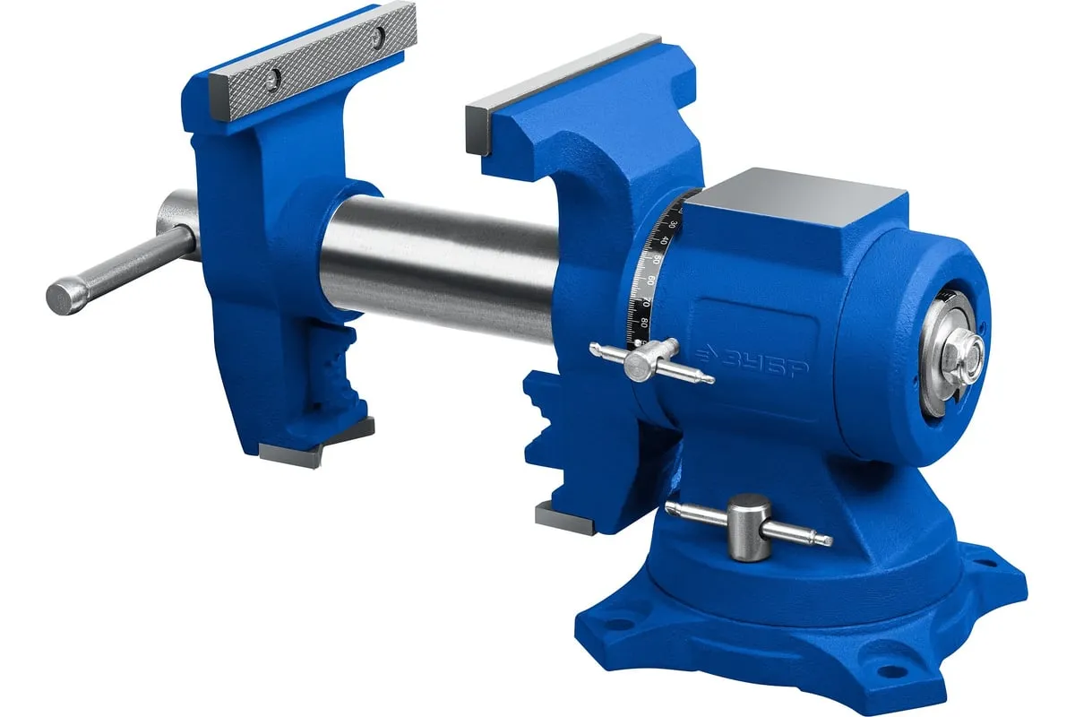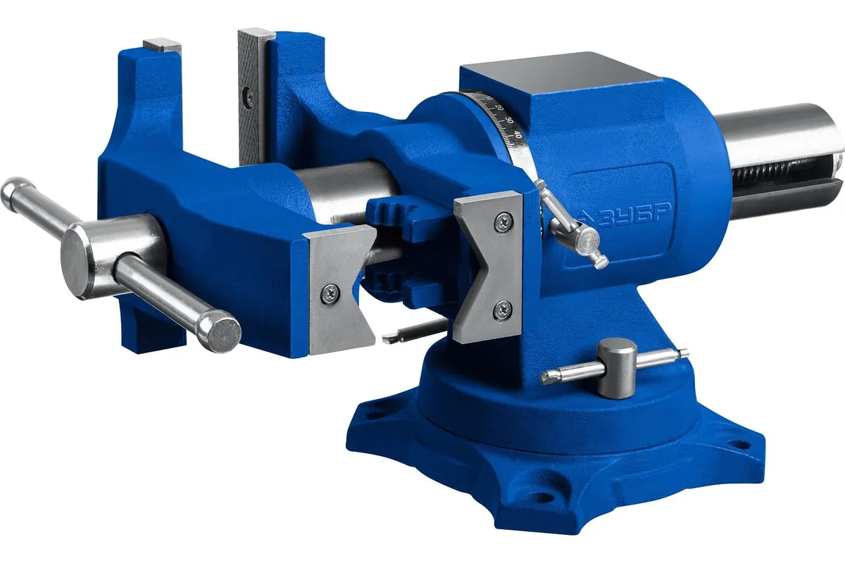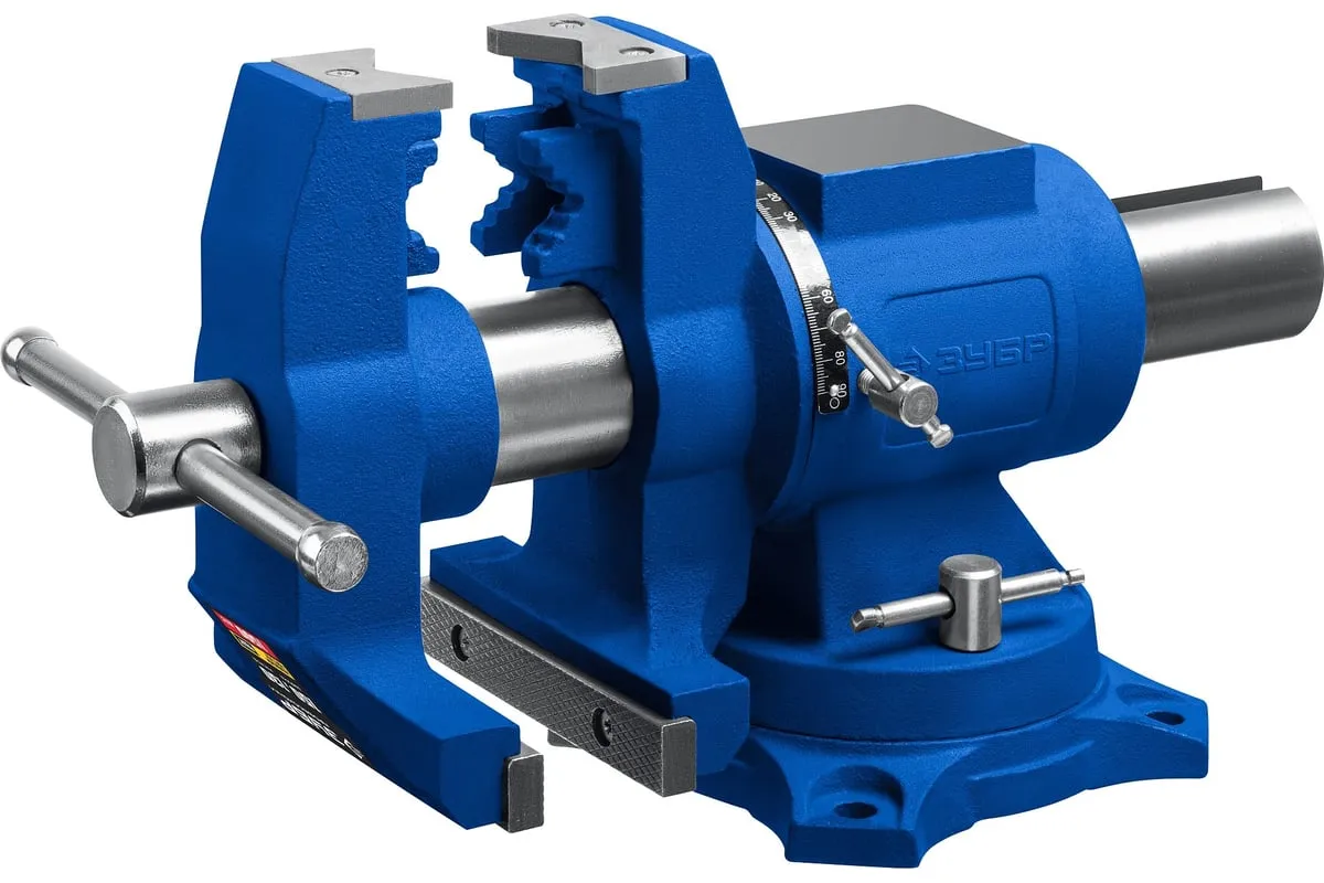 Многофункциональные слесарные тиски - профессиональный многофункциональный инструмент из высококачественного чугуна с двойным зажимом для труб и возможностью поворота в двух плоскостях на 360 градусов. Применяется для зажима различных предметов или их отдельных составных элементов в том числе и округлой формы. Корпус и подвижная планка изготовлены из высококачественного чугуна марки СЧ-25 по ГОСТ 26359. Цилиндрическая форма и закрытый корпус тисков обеспечивают плавный ход подвижной планки, отсутствие люфта и защиту механизма от повреждений и загрязнений. Сменные губки из высококачественной инструментальной стали закаленной до 45-53HRC тщательно отшлифованы. На рабочую поверхность губок нанесены специальные рифления для надежного и безопасного крепления деталей. Специальные губки для закрепления труб и деталей круглой формы.