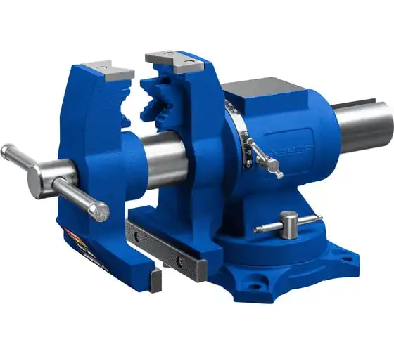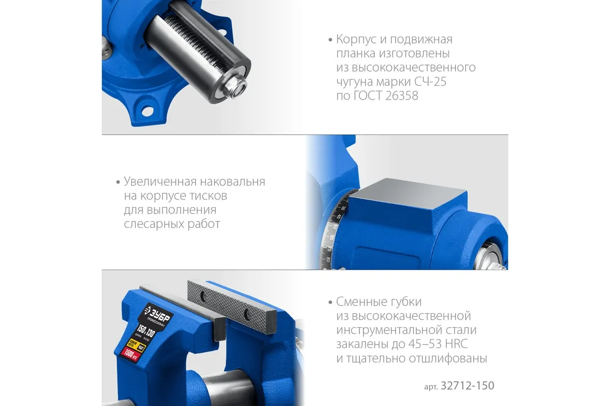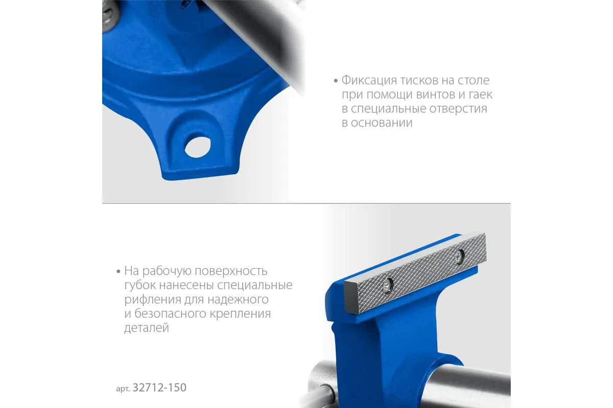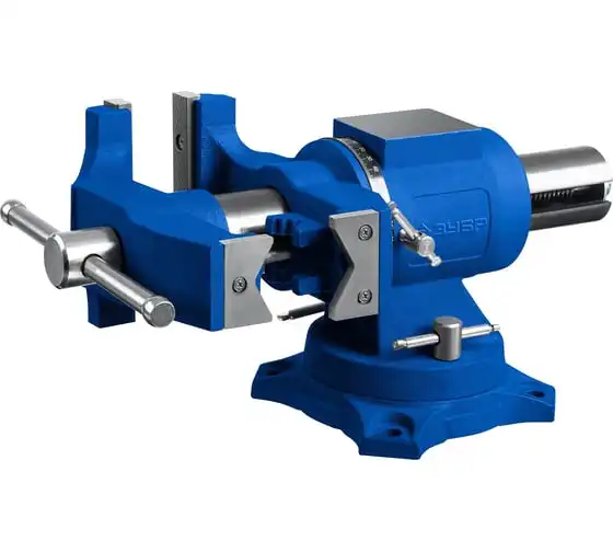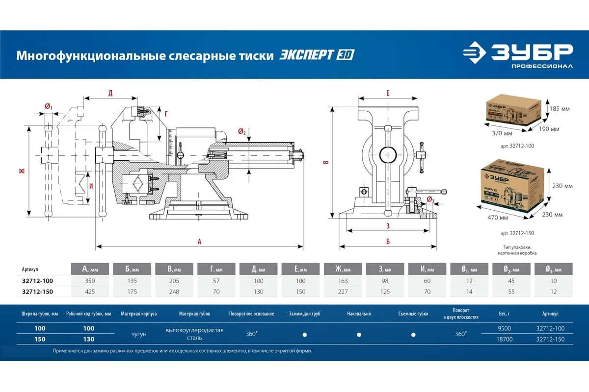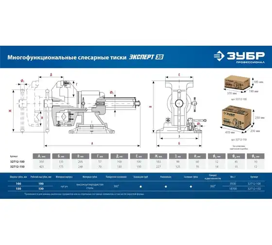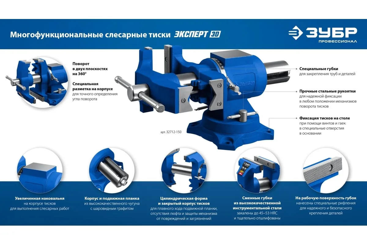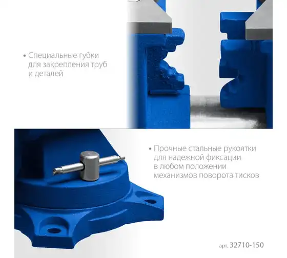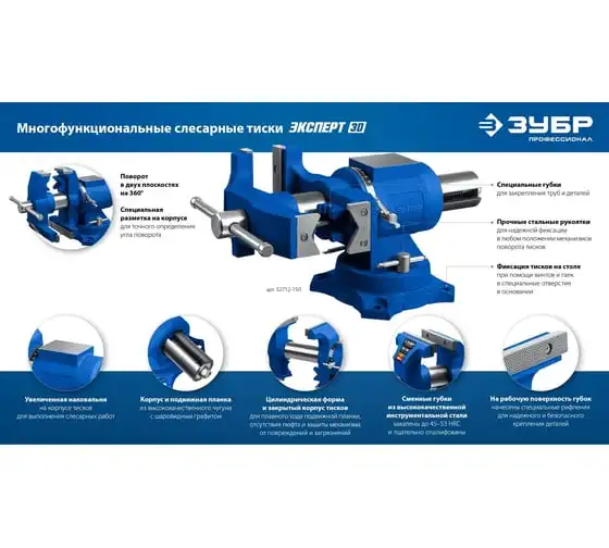 Многофункциональные слесарные тиски - профессиональный многофункциональный инструмент из высококачественного чугуна с двойным зажимом для труб и возможностью поворота в двух плоскостях на 360 градусов. Применяется для зажима различных предметов или их отдельных составных элементов в том числе и округлой формы. Корпус и подвижная планка изготовлены из высококачественного чугуна марки СЧ-25 по ГОСТ 26359. Цилиндрическая форма и закрытый корпус тисков обеспечивают плавный ход подвижной планки, отсутствие люфта и защиту механизма от повреждений и загрязнений. Сменные губки из высококачественной инструментальной стали закаленной до 45-53HRC тщательно отшлифованы. На рабочую поверхность губок нанесены специальные рифления для надежного и безопасного крепления деталей. Специальные губки для закрепления труб и деталей круглой формы.