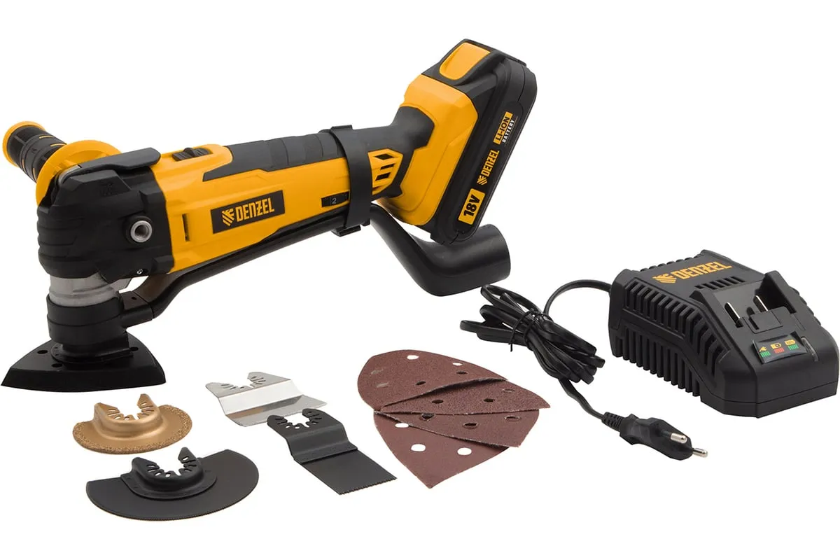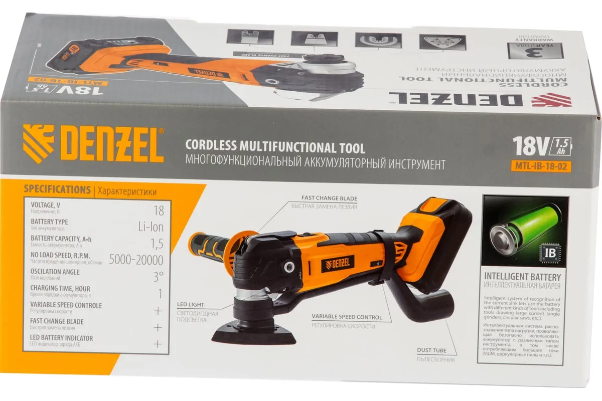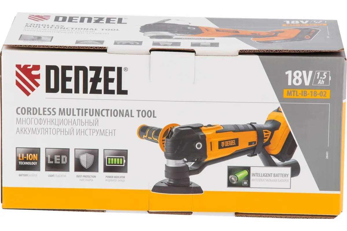 Многофункциональный аккумуляторный инструмент DENZEL MTL-IB-18-02 28401 применяется для распила, шлифовки или обдирки металла, дерева, керамики.