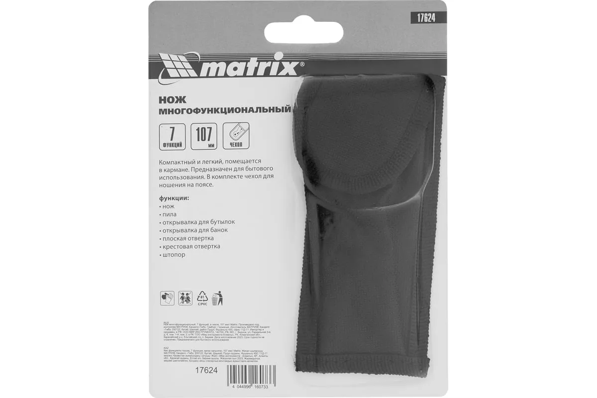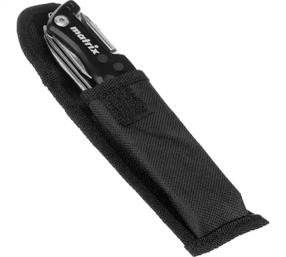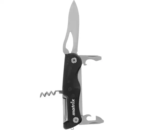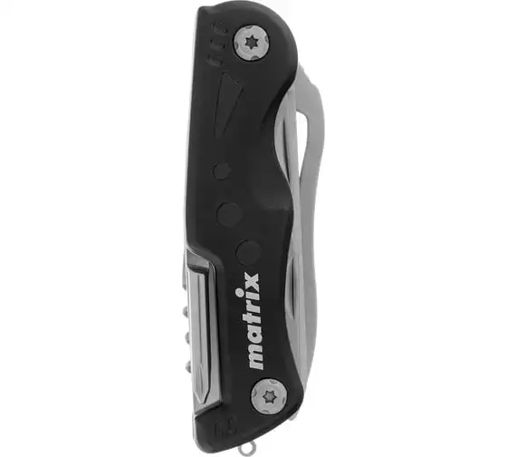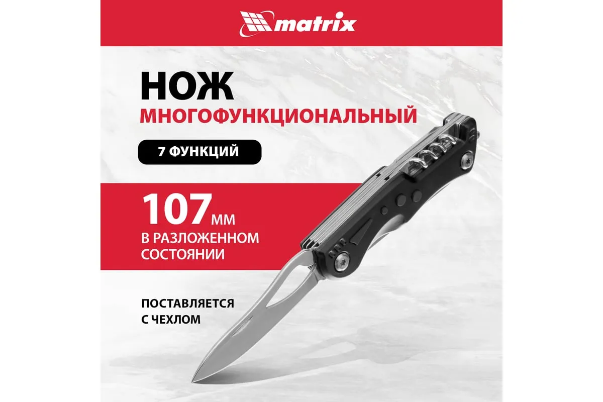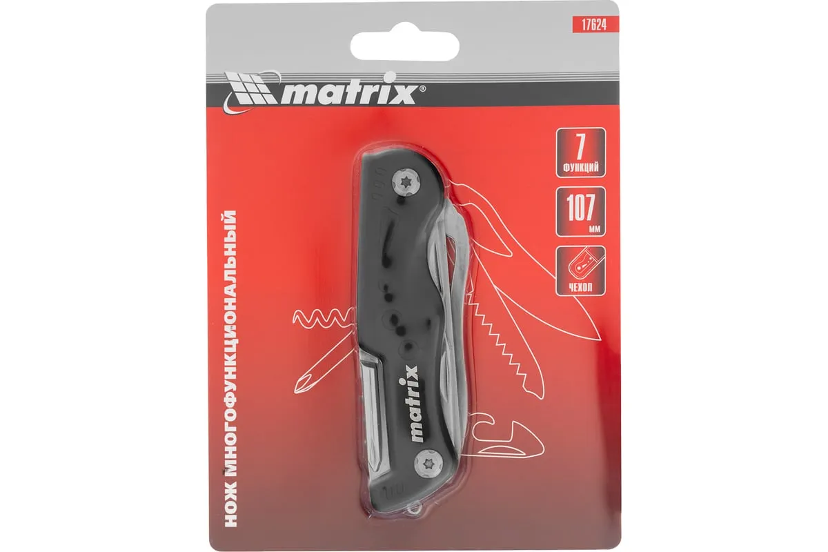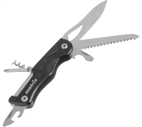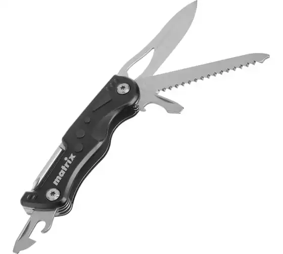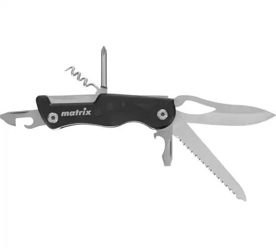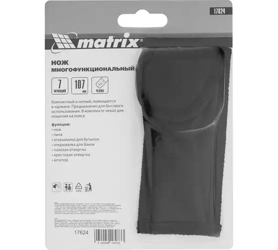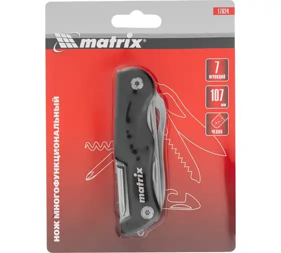 Многофункциональный нож Matrix 17624 длиной 107 мм имеет 7 функций и поставляется с чехлом. Способен резать картон и другие материалы, откручивать и закручивать резьбовой крепеж, открывать бутылки и консервные банки. Складной нож будет полезен дома, на даче, на пикнике, охоте или рыбалке, также пригодится в гараже.