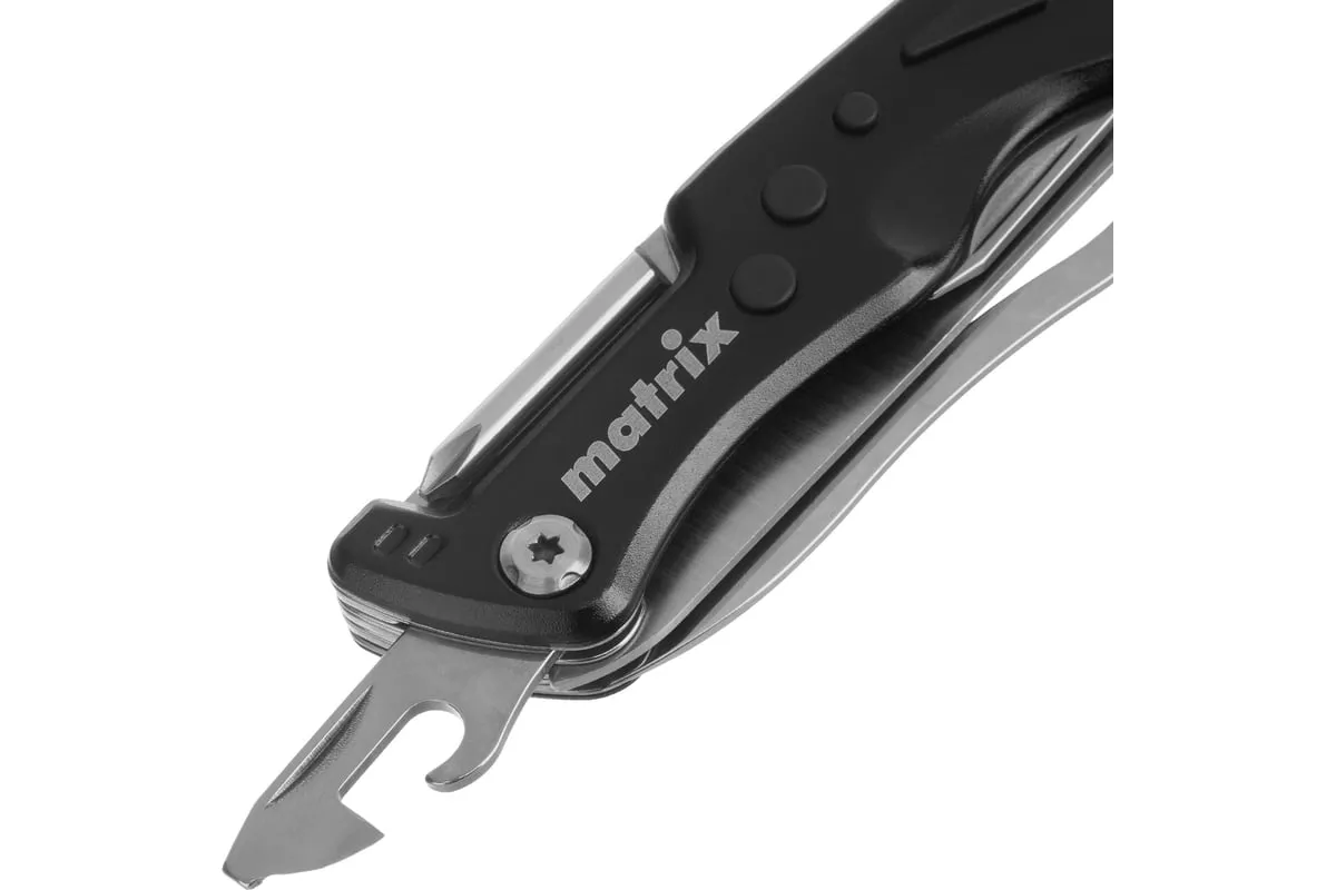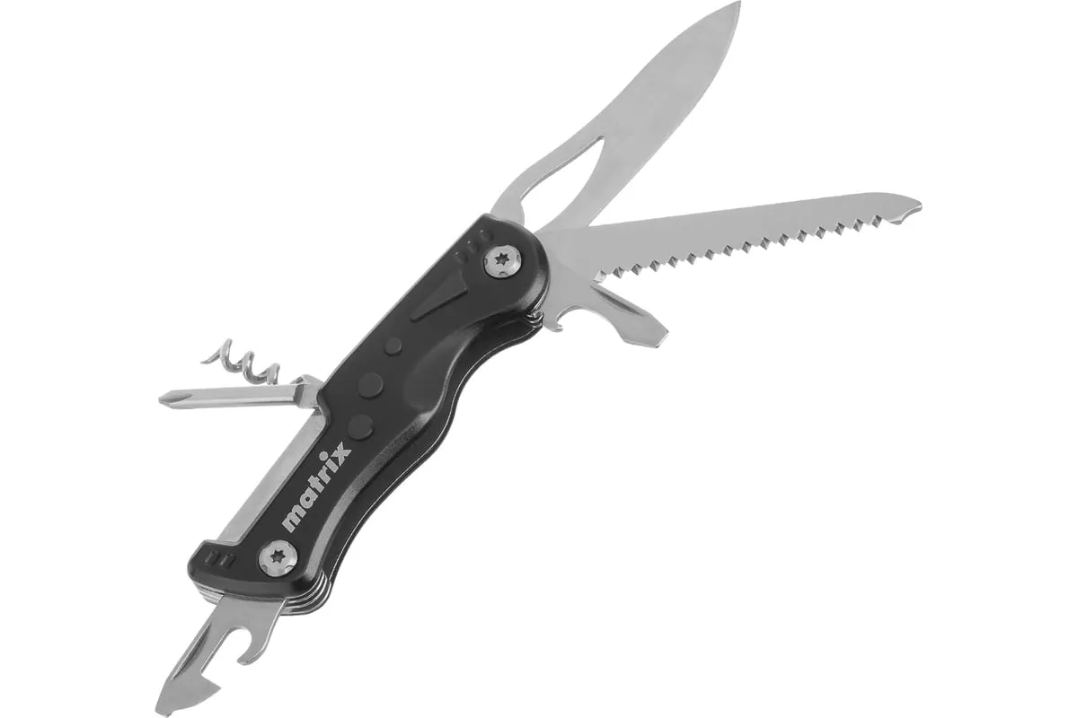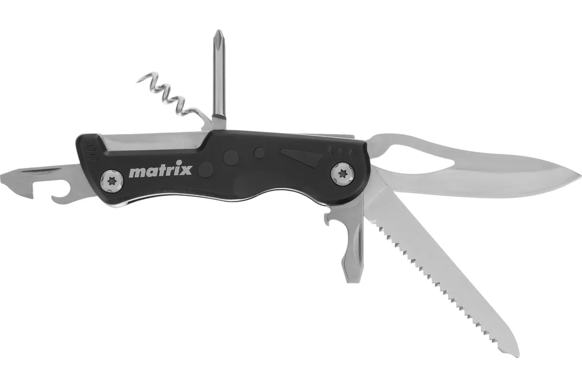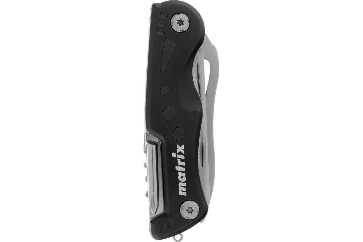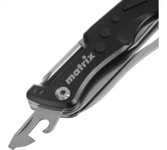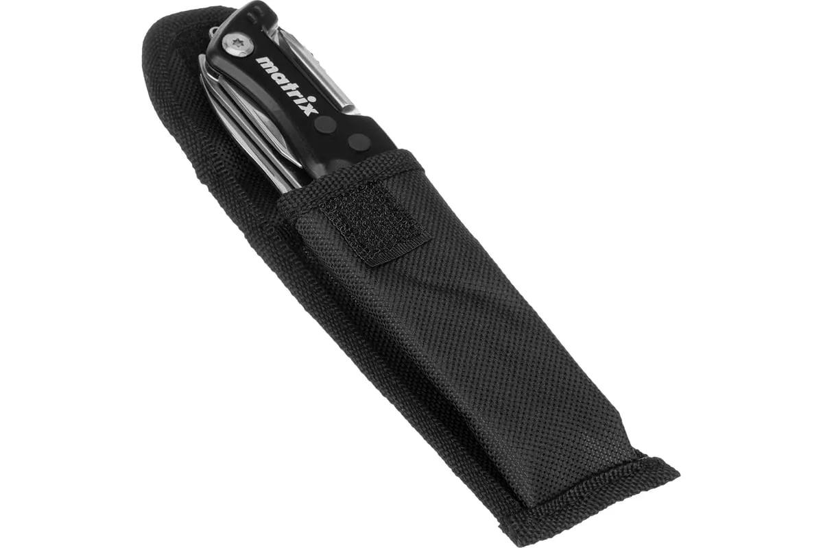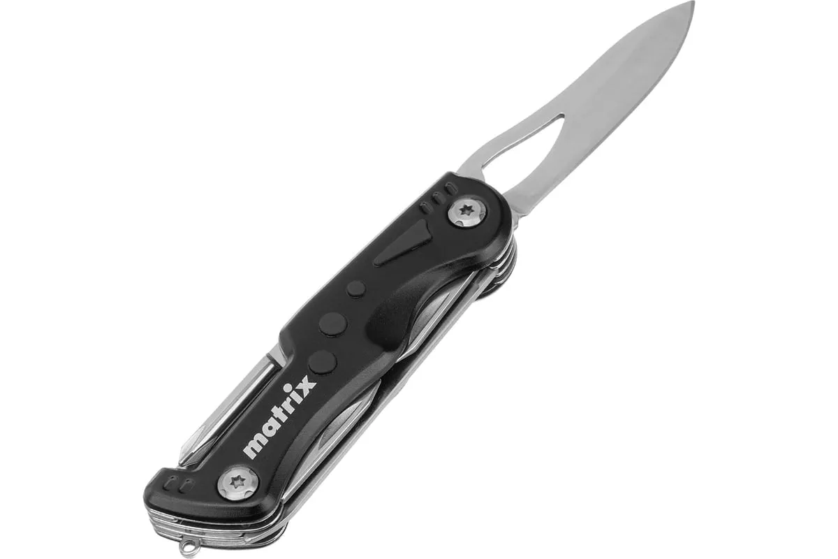 Многофункциональный нож Matrix 17624 длиной 107 мм имеет 7 функций и поставляется с чехлом. Способен резать картон и другие материалы, откручивать и закручивать резьбовой крепеж, открывать бутылки и консервные банки. Складной нож будет полезен дома, на даче, на пикнике, охоте или рыбалке, также пригодится в гараже.