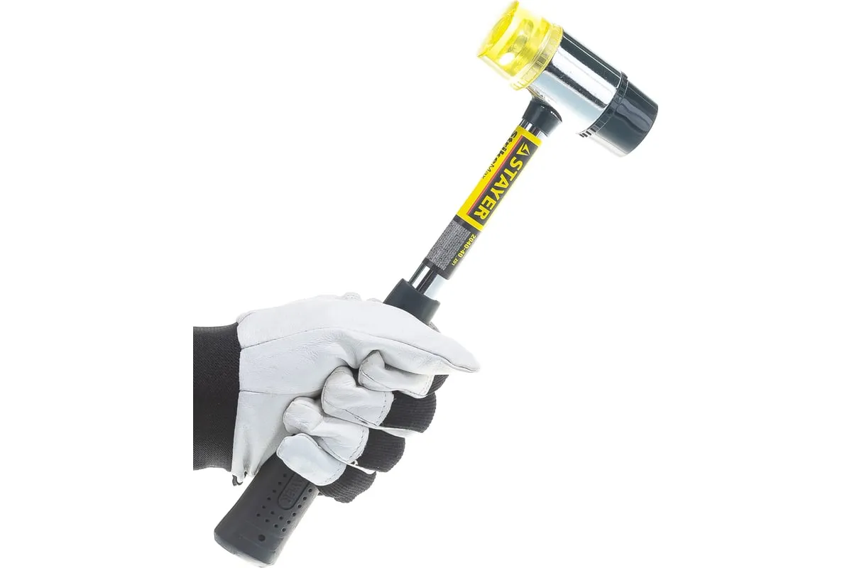 Многофункциональный сборочный молоток 40мм STAYER MASTER 2040-40_z01 - удобный, надежный и долговечный в работе ручной рихтовочный инструмент высокого качества, который служит для восстановления повреждений на металлических поверхностях. Рукоятка изготовлена из прочного металла и оснащена прорезиненной накладкой. Ударная часть снабжена двумя бойками различной твердости, которые легко поддаются замене при необходимости. Длина молотка составляет 305 мм.