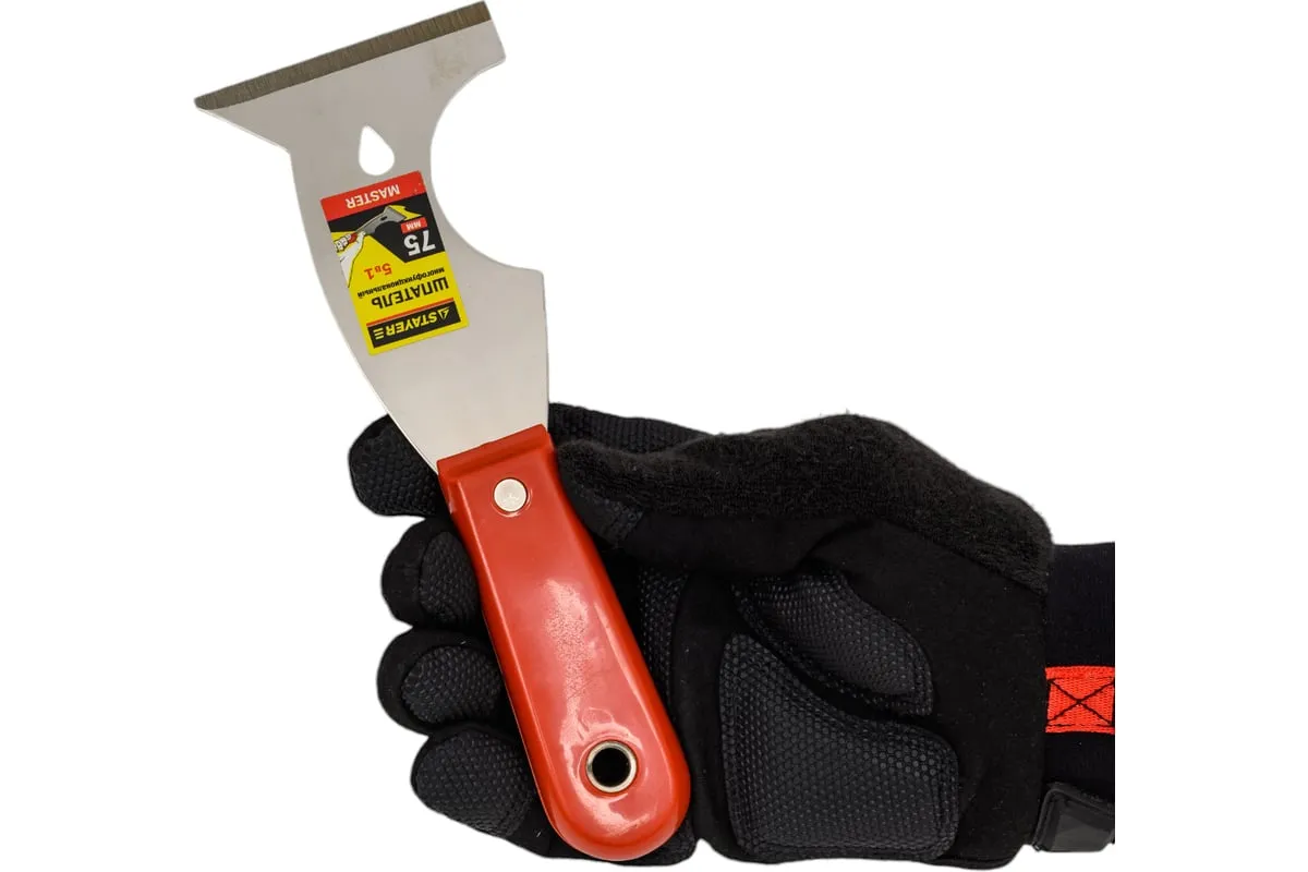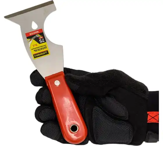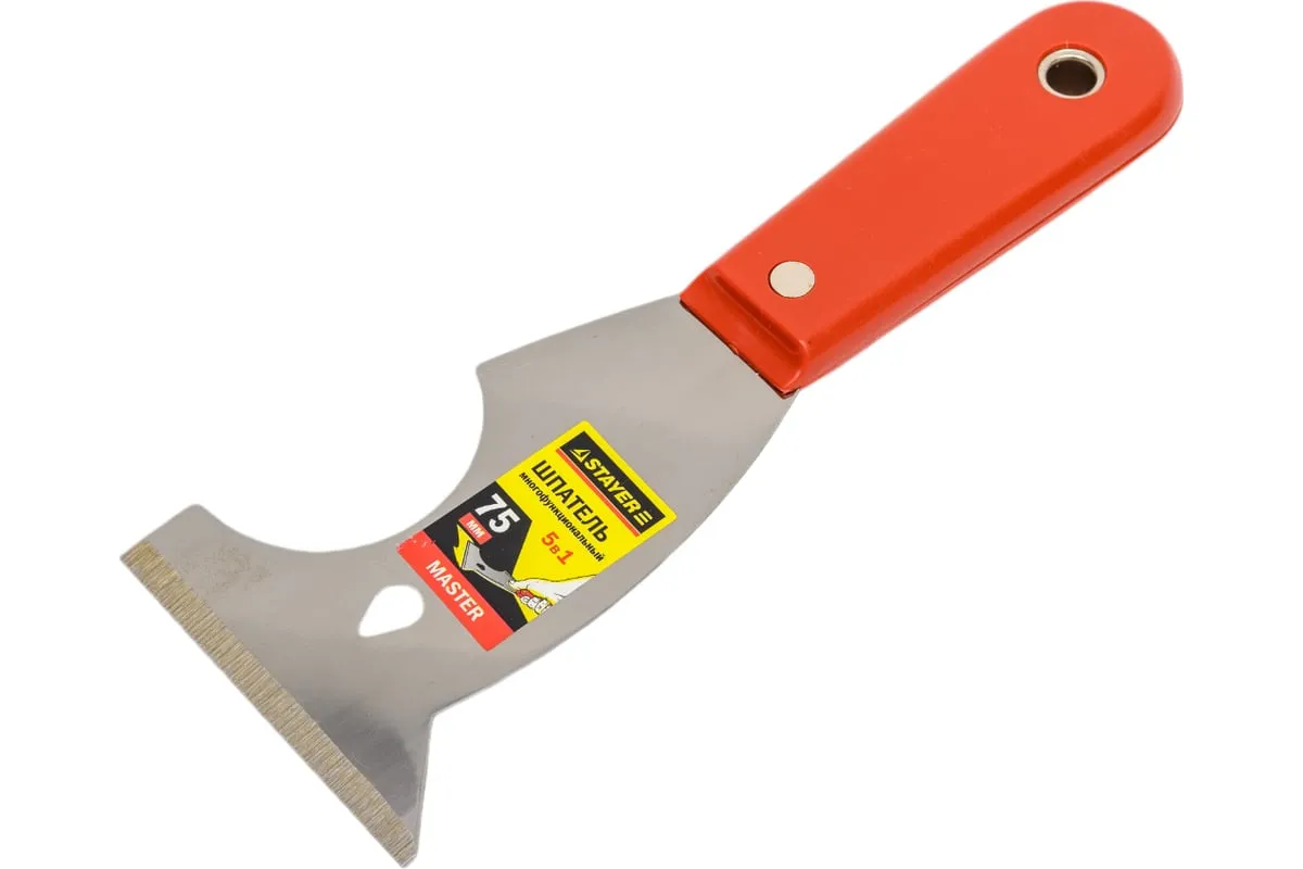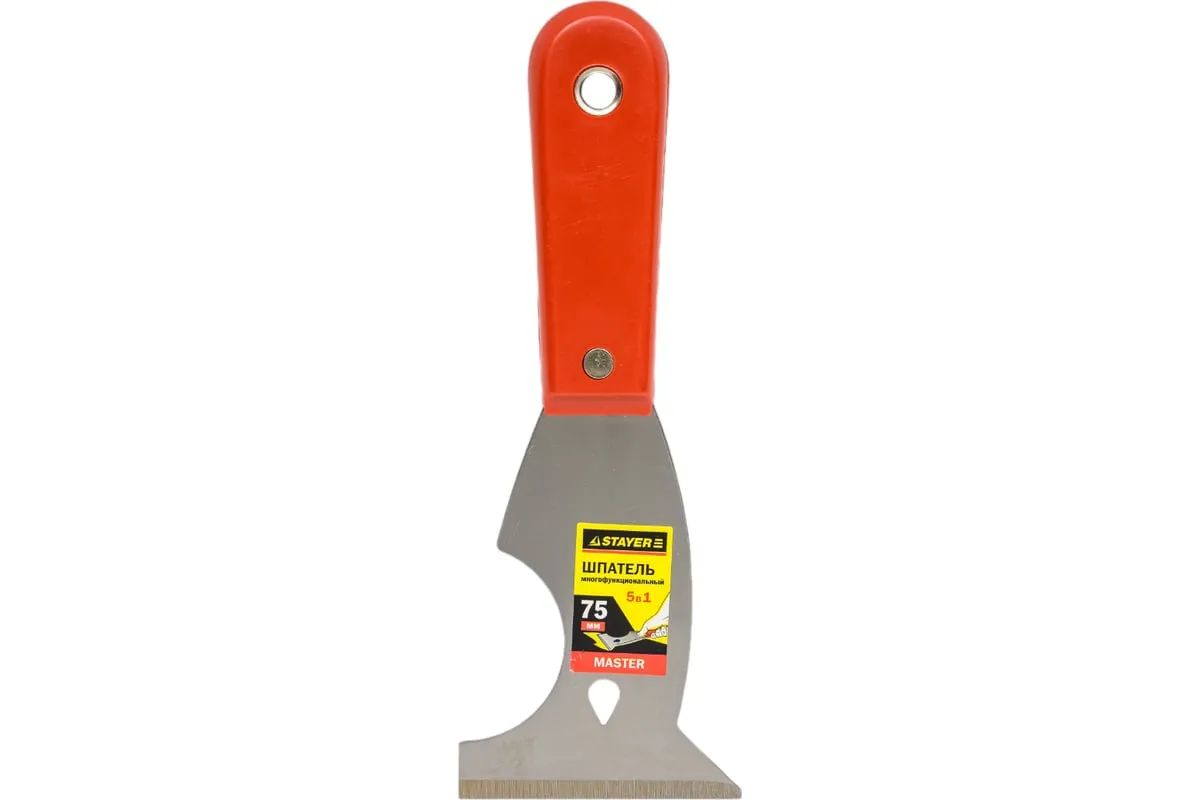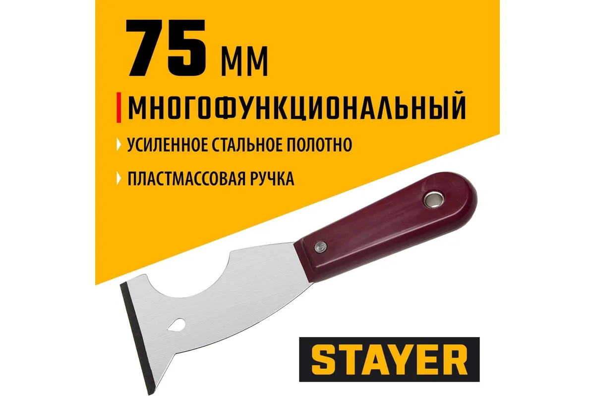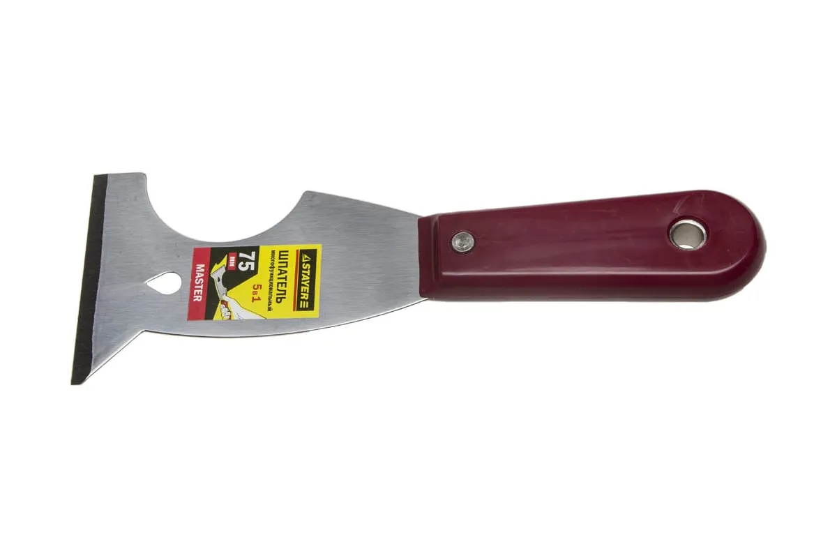 Многофункциональный шпатель с пластмассовой ручкой STAYER 10031 предназначен для проведения различных малярных и штукатурных работ. Благодаря оригинальной форме полотна инструмент может применяться в качестве гвоздодера, скребка, шпателя, резака, удалителя краски с валиков. Усиленное стальное полотно обеспечивает надежность инструмента, а удобная пластмассовая рукоятка создает условия для комфортной работы.
