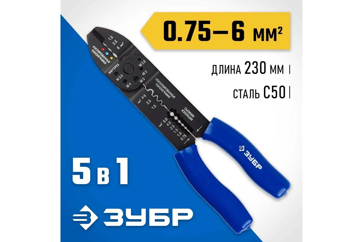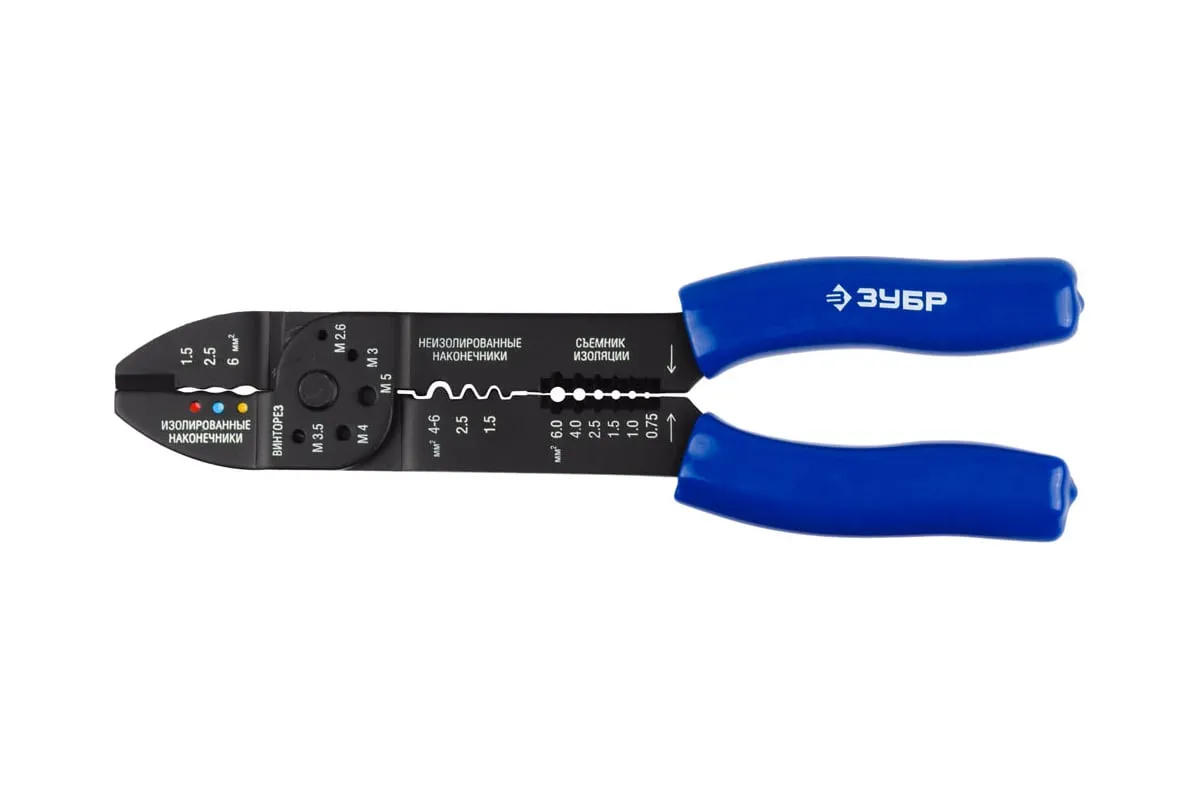 Многофункциональный стриппер ЗУБР ММ-30, 0.75 - 6 мм2 22668-23 - это съемник 0,8-2,6мм, кусачки, обжим наконечников, винторез, обжим автомобильных клемм. Специальная конструкция рабочей части позволяет выполнять множество работ с электрическими проводами. Данный инструмент служит для снятия изоляции при зачистке проводов и кабелей, обжима изолированных и неизолированных наконечников, резки кабелей, отрезания латунных болтов. Дополнительные характеристики