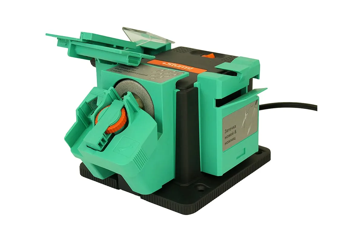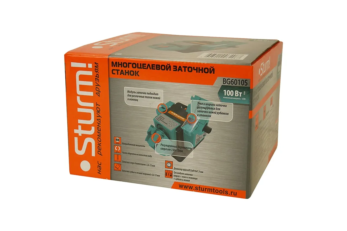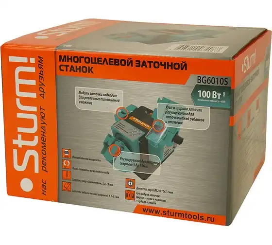 Многофункциональный точильный станок Sturm BG6010S применяется в небольших мастерских для заточки различного режущего инструмента (сверл диаметром 3-13 мм, лезвий рубанков шириной 6-51 мм, ножей, ножниц). Выполнение работ обеспечивает шлифовальный круг диаметром 49.3 мм. Защитный экран из прозрачного пластика дает возможность оператору визуально наблюдать выполнение операции. Станок имеет малые габаритные размеры и вес, что позволяет с легкостью переносить установку.