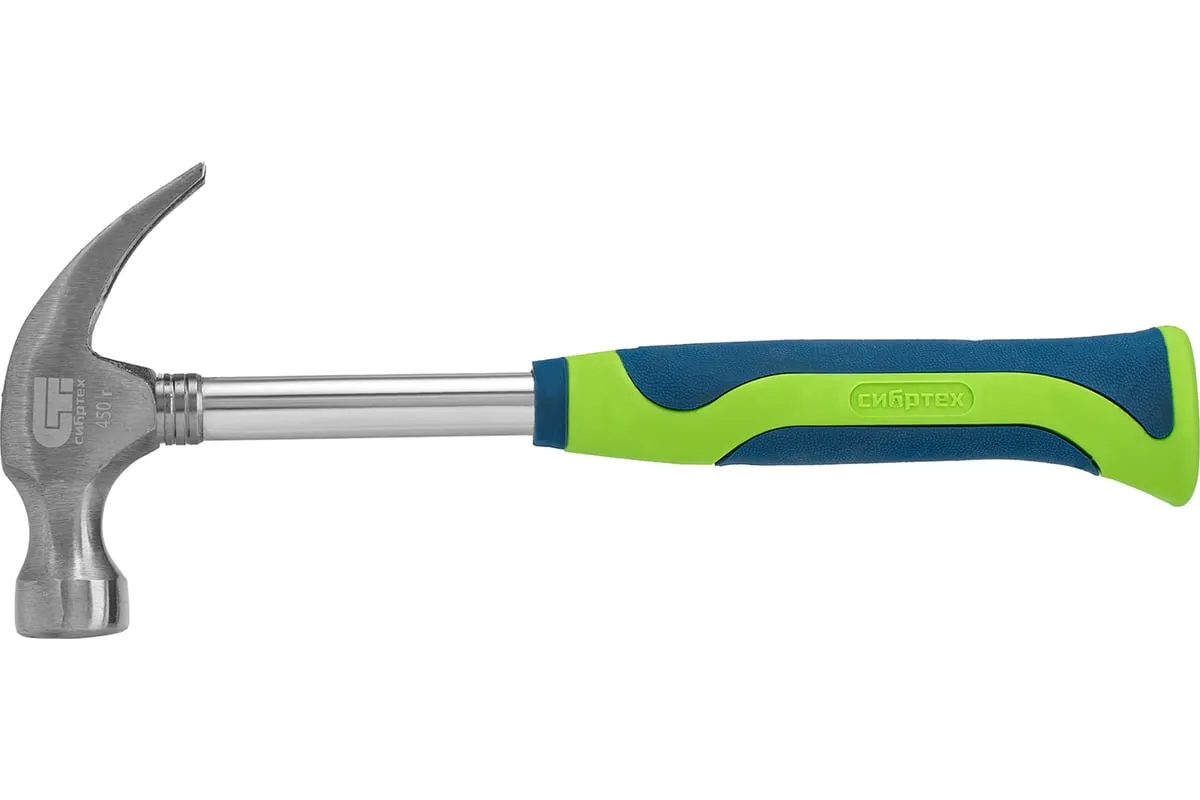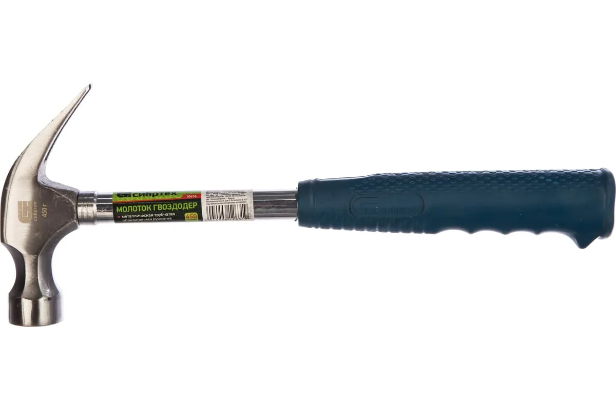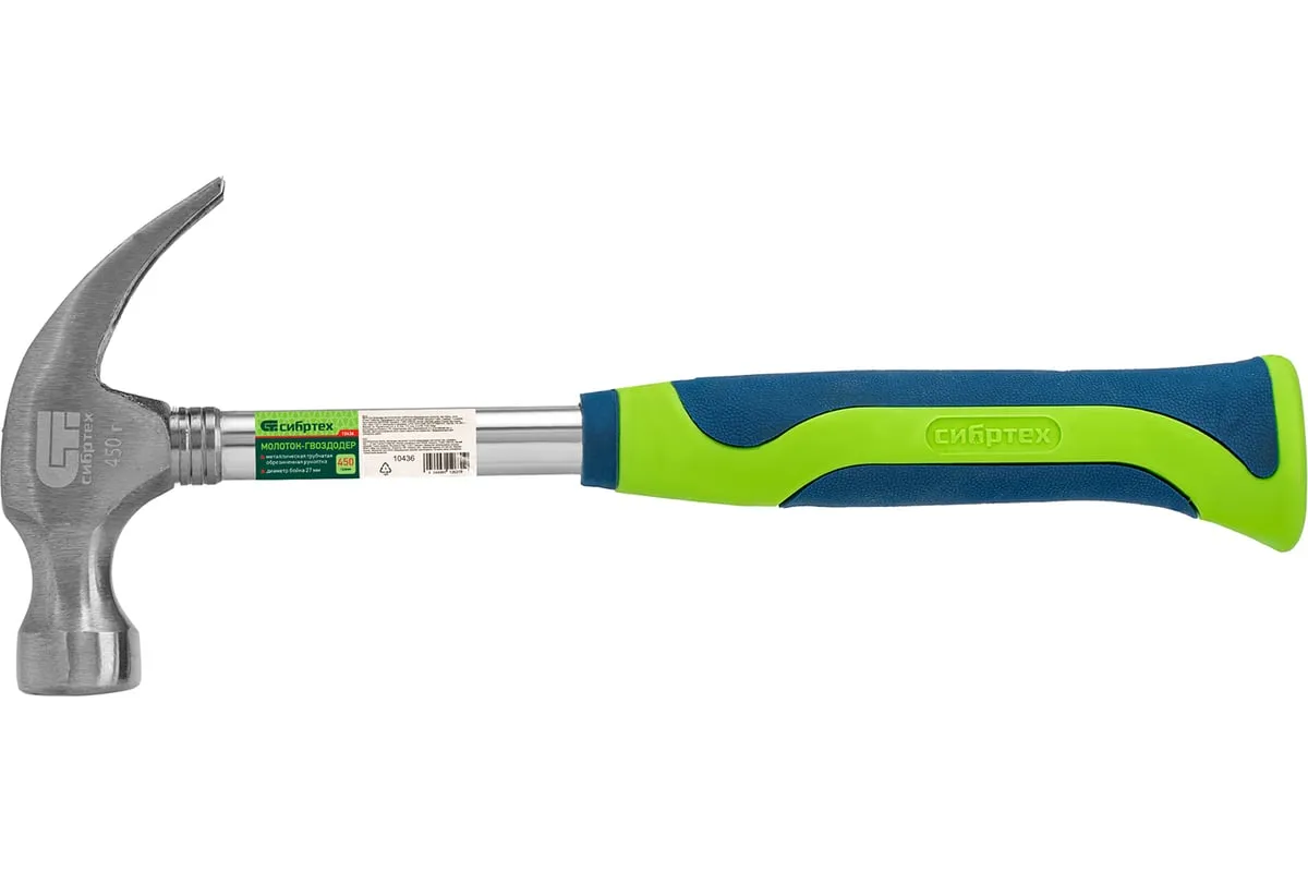 Молоток-гвоздодер Сибртех 10436 длиной 315 мм, с головкой весом 450 г и размером бойка 27 мм, с металлической трубчатой обрезиненной рукояткой, предназначен для проведения монтажных и демонтажных работ. Им удобно забивать крепежные элементы, кроме того, инструмент позволяет выпрямить загнувшийся гвоздь. Молоток полезен на стройплощадке, при сборке мебели, во время отделочных работ, пригодится также для использования в домашних условиях.