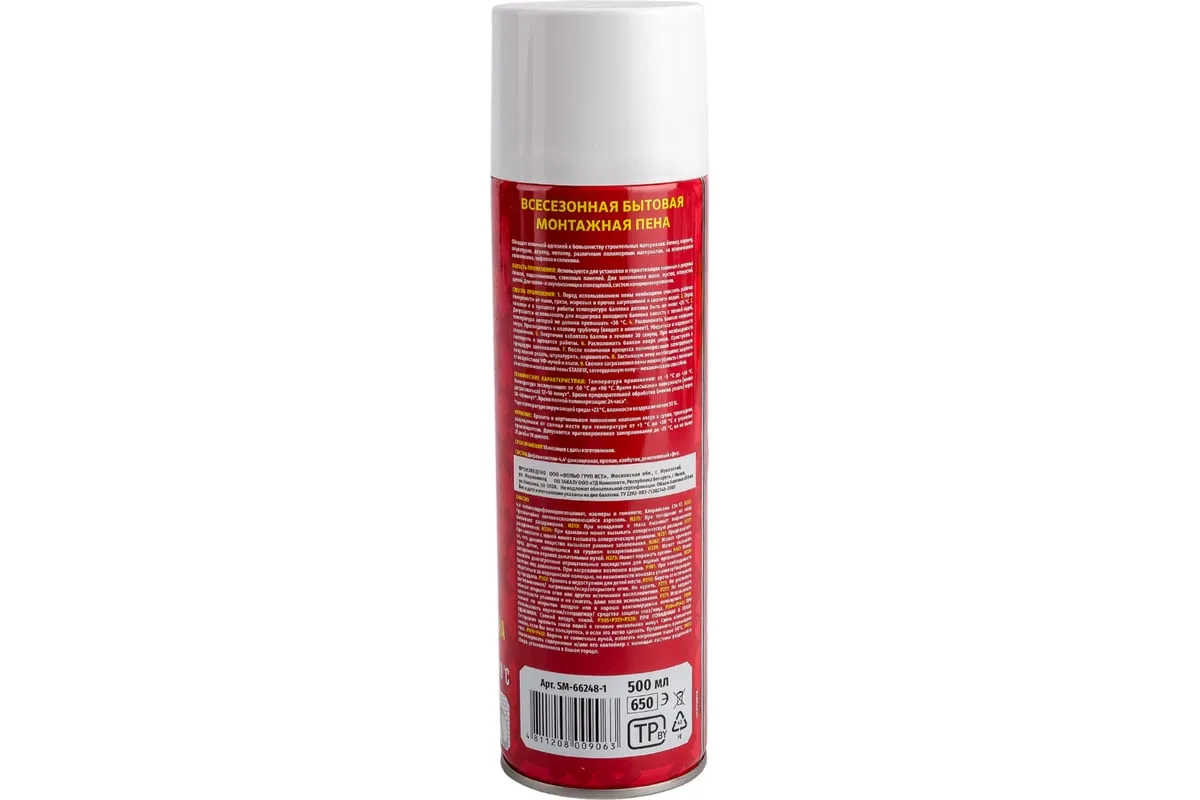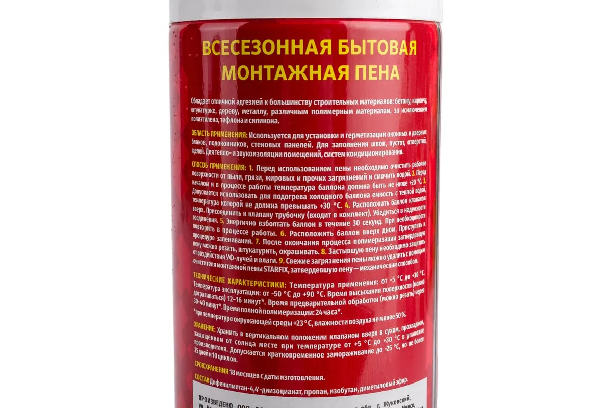 Монтажная пена STARFIX Straw Foam 500 мл SM-66248-1 обладает отличной адгезией к большинству строительных материалов: бетону, кирпичу, штукатурке, дереву, металлу, различным полимерным материалам, за исключением полиэтилена, тефлона и силикона. Используется для установки и герметизации оконных и дверных блоков, подоконников, стеновых панелей, для заполнения швов, пустот, отверстий, щелей, а также для теплоизоляции и звукоизоляции помещений, систем кондиционирования.