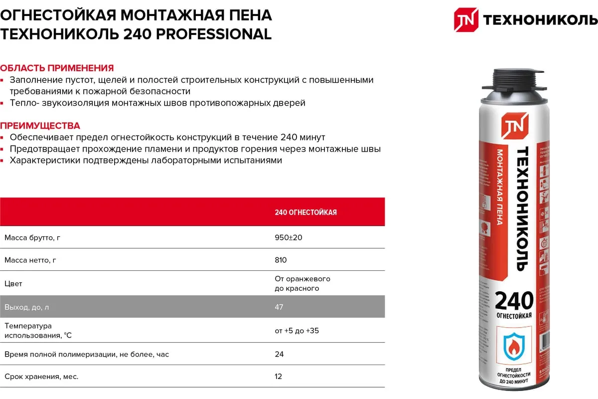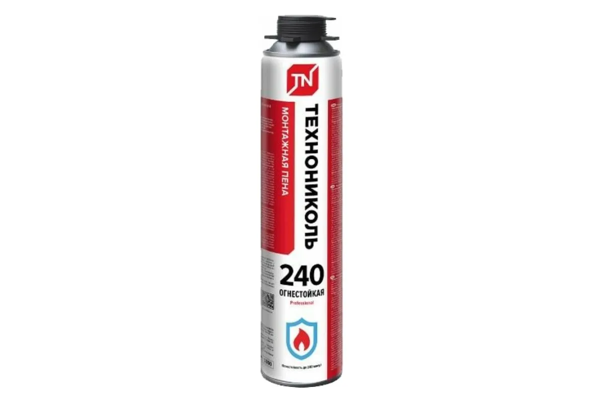 Монтажная пена Технониколь 240 PROFESSIONAL огнестойкая TN528380 представляет собой однокомпонентный полиуретановый материал в аэрозольной упаковке с улучшенными противопожарными свойствами. Огнестойкость пены подтверждена сертификатом соответствия в области пожарной безопасности и достигает 240 минут.