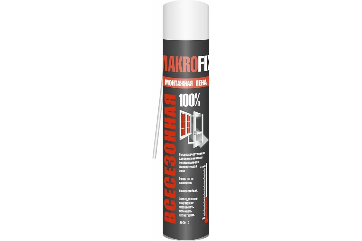 Монтажная полиуретановая пена MAKROFIX (бытовая; всесезонная; 750 мл) 2107 - это однокомпонентная полиуретановая монтажная пена быстрого затвердевания, не требующая для выпуска дополнительных приспособлений. Рекомендуется использовать при установке дверных коробок и оконных рам, изоляции и фиксации труб, для заполнения отверстий и швов, а также для тепло- и звукоизоляции. ыпущенная из баллона пена затвердевает под воздействием влажности воздуха и образует однородную, полужесткую, пористую структуру. В процессе затвердевания пена увеличивается в объеме в 3-4 раза, что позволяет заполнить любые пустоты.