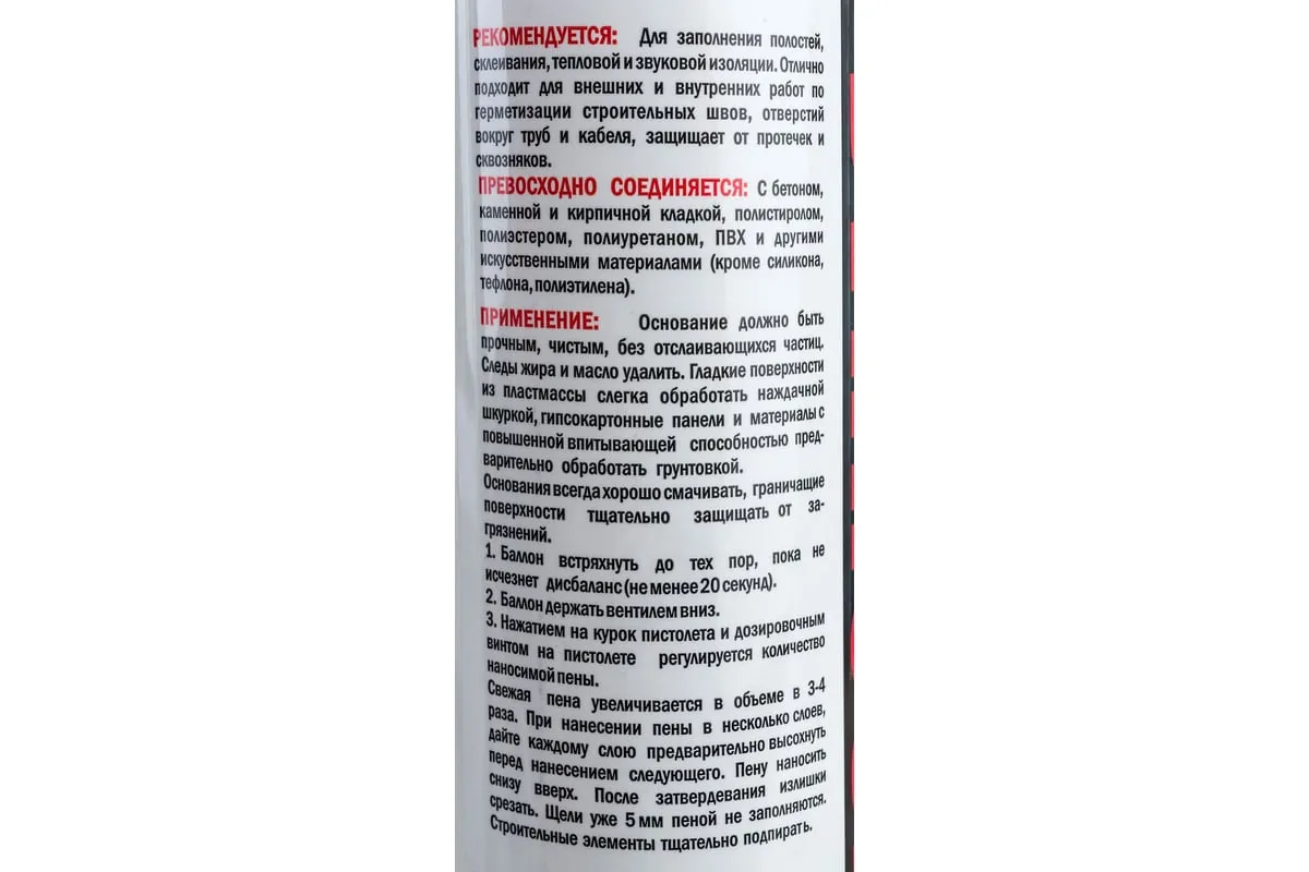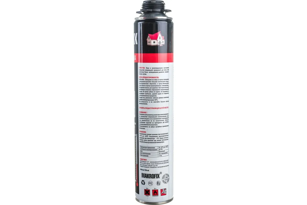 Монтажная полиуретановая пена MAKROFIX профессиональная, всесезонная, 750 мл 2103P - это однокомпонентная полиуретановая монтажная пена быстрого затвердевания, не требующая для выпуска дополнительных приспособлений. Рекомендуется использовать при установке дверных коробок и оконных рам, изоляции и фиксации труб, для заполнения отверстий и швов, а также для тепло- и звукоизоляции. Выпущенная из баллона пена затвердевает под воздействием влажности воздуха и образует однородную, полужесткую, пористую структуру. В процессе затвердевания пена увеличивается в объеме в 3-4 раза, что позволяет заполнить любые пустоты.