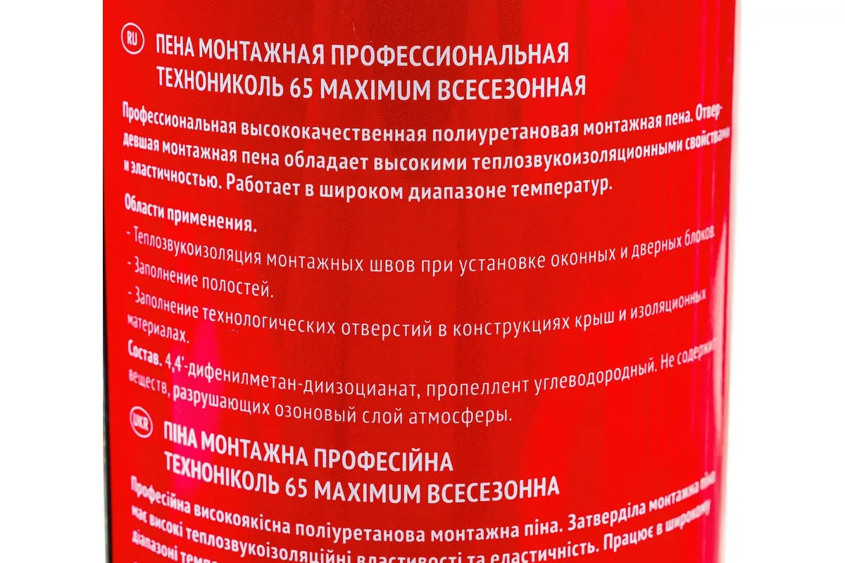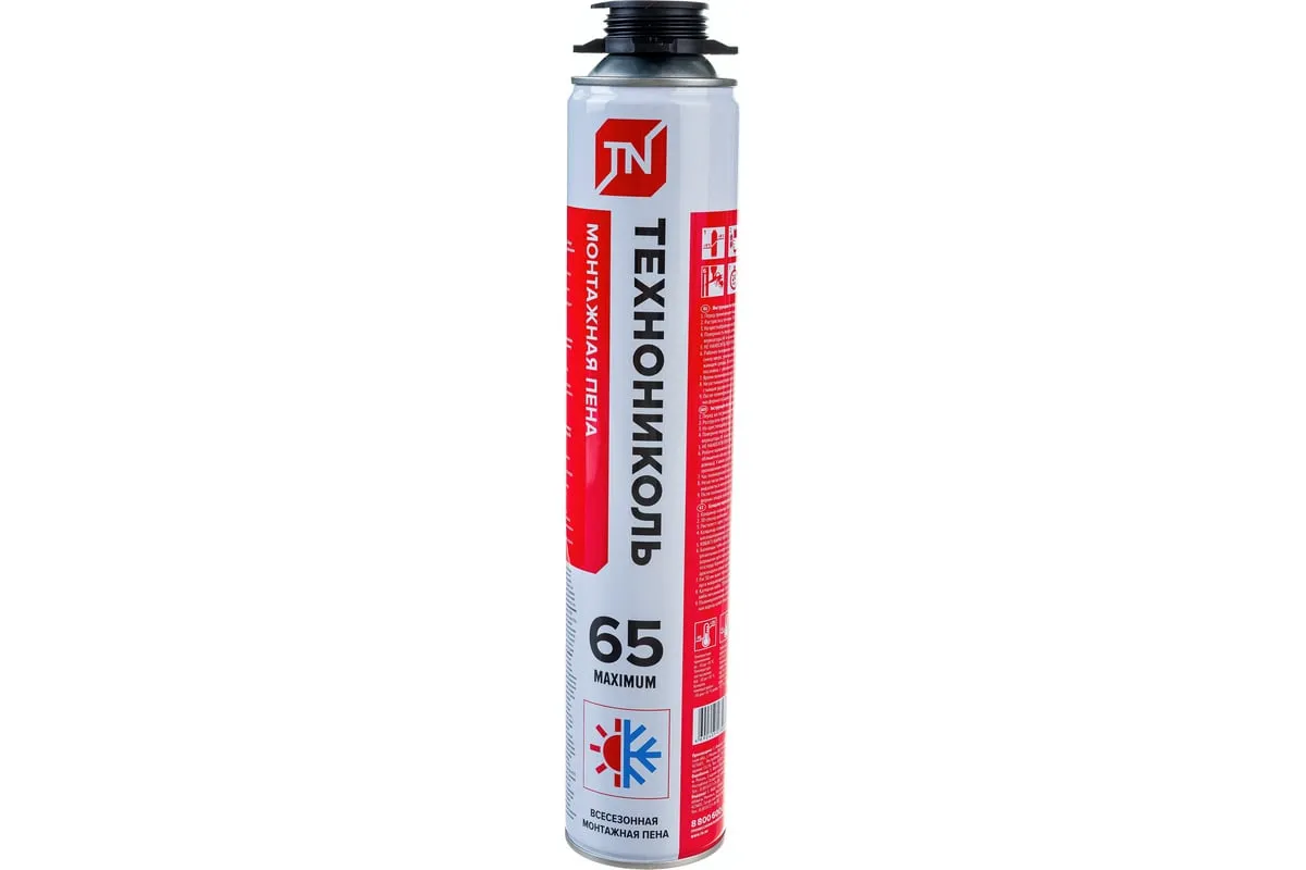 Монтажная профессиональная пена Технониколь 65 MAXIMUM всесезонная TN528370 представляет собой однокомпонентный полиуретановый материал в аэрозольной упаковке. Продукт отличается хорошим первичным расширением, повышенным объёмом выхода пены.