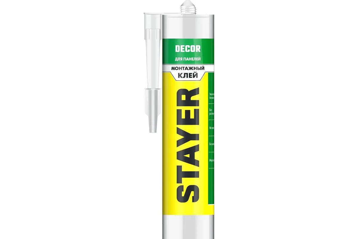 Монтажный клей для молдингов STAYER Professional 280мл 41327 применяется для внутренних и наружных работ. Склеивает в различных сочетаниях большинство строительных материалов: металлы, керамику, бетон, кирпич, дерево, пластик, пенопласт, любые типы панелей. Рекомендуется к использованию для приклеивания легких элементов декора (молдингов, лепнины, потолочной плитки, уголков, плинтусов, бордюров и др.) из пластика, пенопласта, ПВХ, резины, гипса и подобных материалов. Не рекомендуется применять для склеивания полиэтилена, полипропилена, тефлона и других подобных материалов.