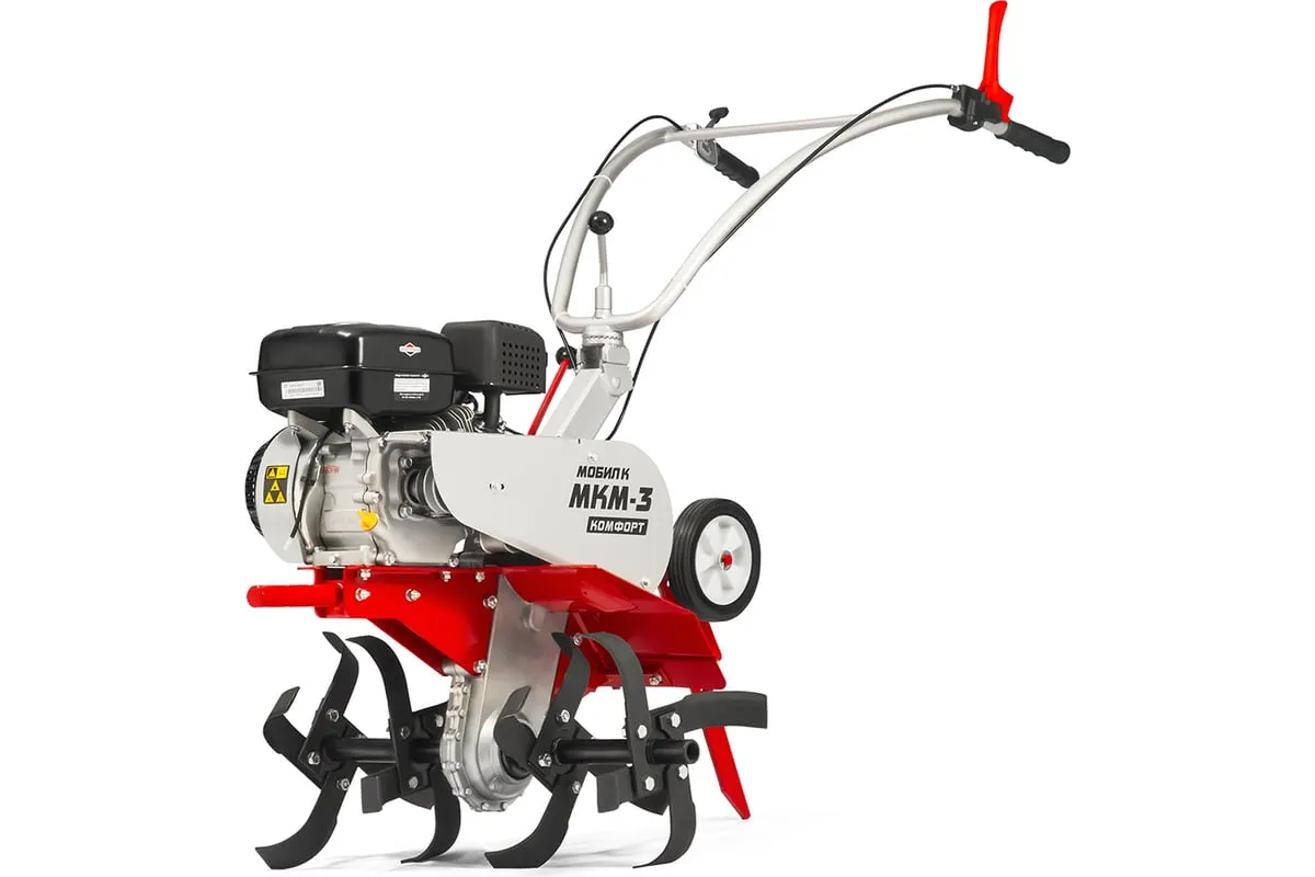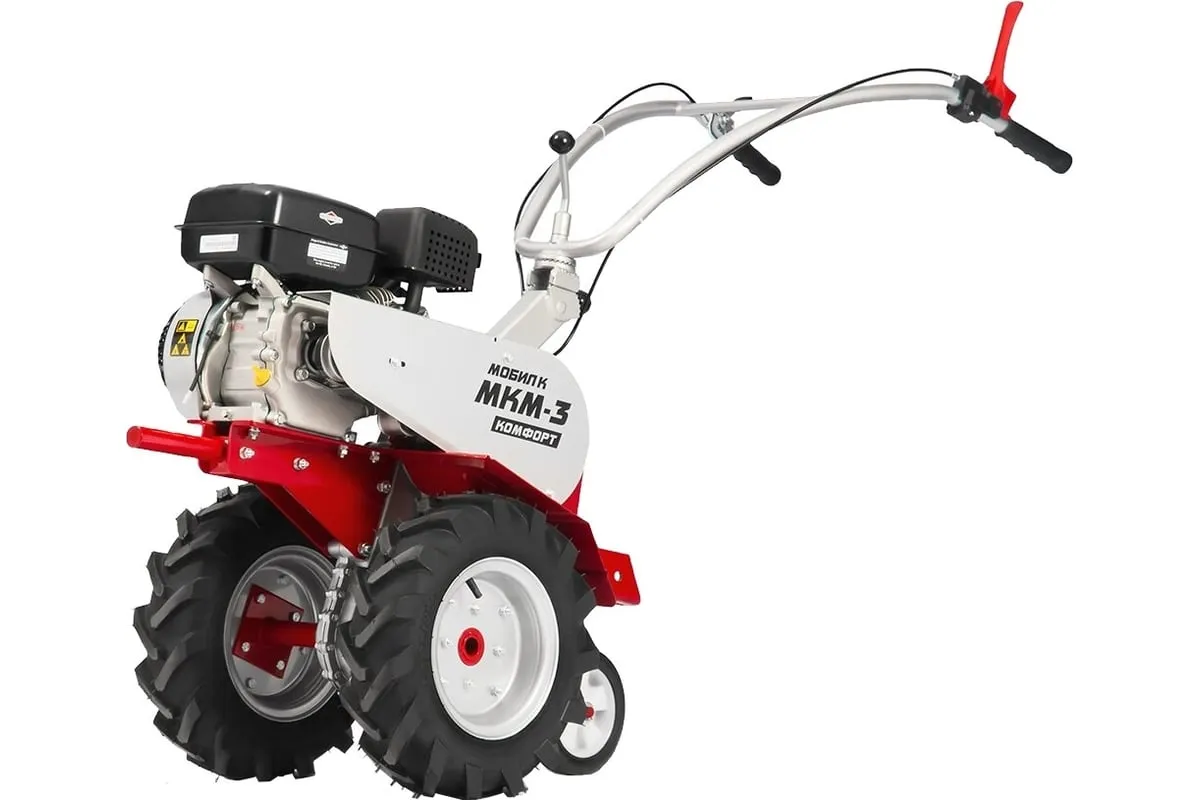 Мотоблок Мобил К МКМ-3 КОМФОРТ MBK0018432 используется с прицепными и навесными орудиями. Оборудован мощным мотором, редуктором в алюминиевом корпусе, регулируемым рулем и комплектом фрез-культиваторов. Сошник с прицепной имеет опорные колеса для перемещения мотоблока. Большие пневматические колеса предназначены для использования с транспортной тележкой. Данный мотоблок может работать с навесным оборудованием: плуг, картофелевыкапыватель, окучник, прицеп, полольники, снегоуборщик, лопата, щетка, насос и т.д. Способен культивировать целину, глинистыеи тяжелые почвы.