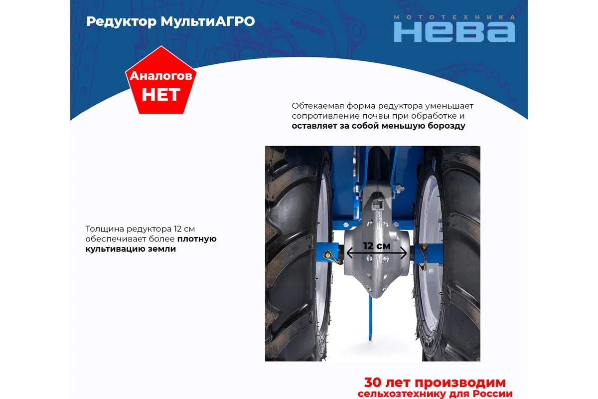 Поддерживать высокий уровень производительности мотоблоку помогает редуктор МультиАГРО, который обеспечивает наилучшую скорость под каждую агротехническую и хозяйственную операцию. Количество передач включает в себя 3-вперед и 1-назад, однако данное количество можно удвоить за счет перестановки ремня на двухручьевых шкивах. В итоге доступным оказываются 6 передач вперед и 2-назад. Такой набор передач существенно расширяет возможности пользователя при выборе эффективной скорости для выполнения на мотоблоке конкретной работы.
