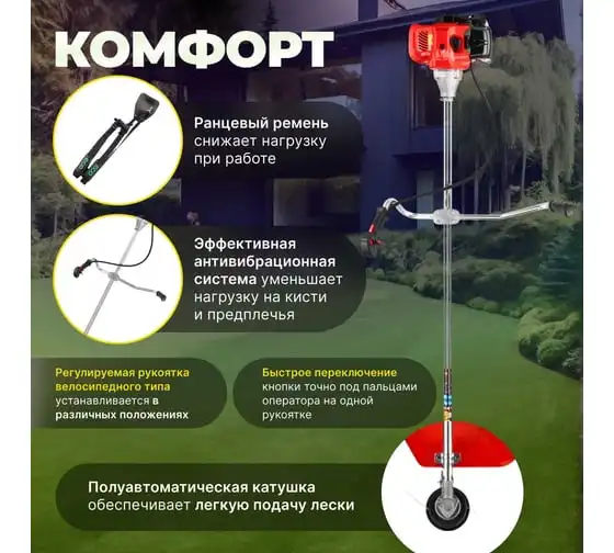 Удобная и эргономичная рукоятка изготовлена в виде велосипедного руля и может устанавливаться в различных положениях, это обеспечивает максимальную управляемость и уменьшает нагрузку на опорно-двигательный аппарат оператора.