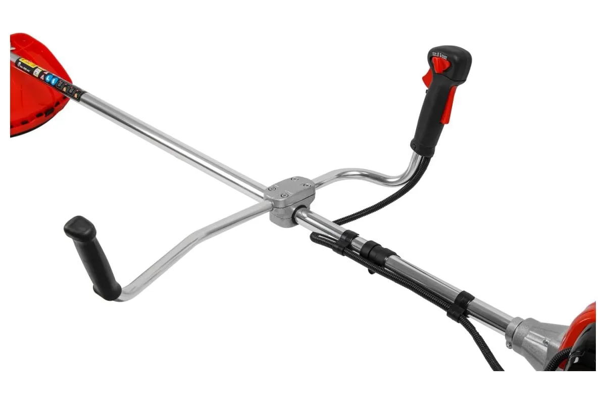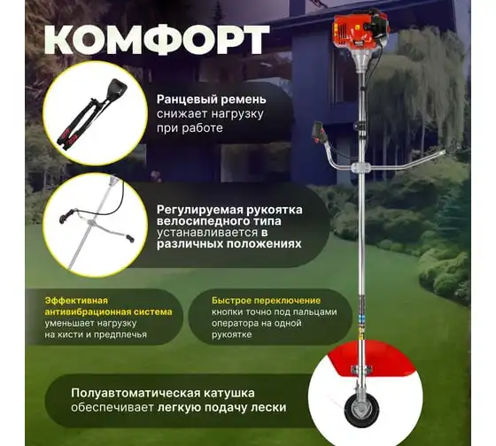 Удобная и эргономичная рукоятка триммера изготовлена в виде велосипедного руля и может устанавливаться в различных положениях, это обеспечивает максимальную управляемость и уменьшает нагрузку на опорно-двигательный аппарат оператора. Блок управления находится на одной ручке, кнопки доступны и располагаются точно под пальцами оператора.