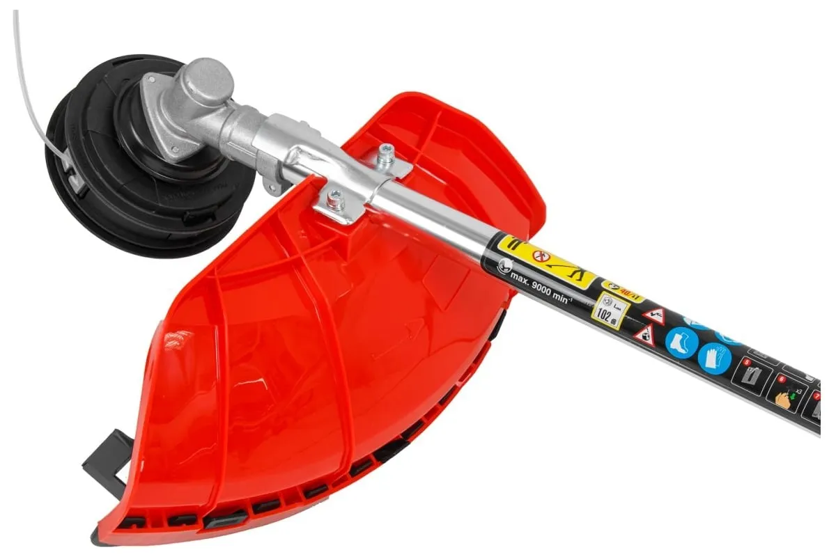 Широкий защитный кожух защищает оператора от выброса травы, камней и других вылетающих из-под режущего инструмента предметов.