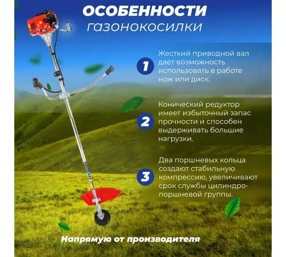 Конический редуктор имеет избыточный запас прочности и способен выдерживать большие нагрузки. При этом редуктор легко отсоединяется, что позволяет использовать двигатель мотокосы в качестве силового агрегата.