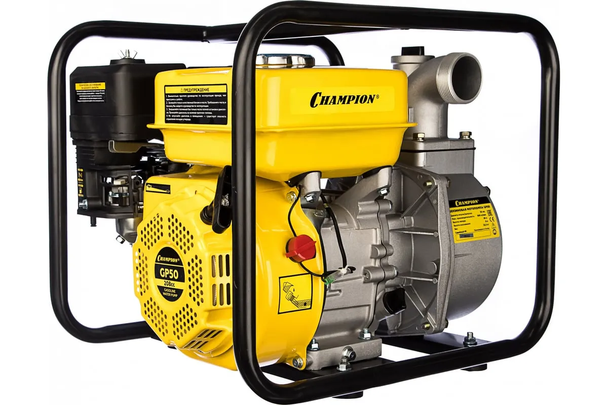 Мотопомпа CHAMPION GP50 оснащена двигателем объемом 208 см3, производительность которого 600 литров в минуту. Мотопомпа оборудована обратным клапаном, который предотвращает всасывание воды из корпуса насоса. Это способствует достаточному количеству воды в корпусе насоса для следующего запуска помпы.