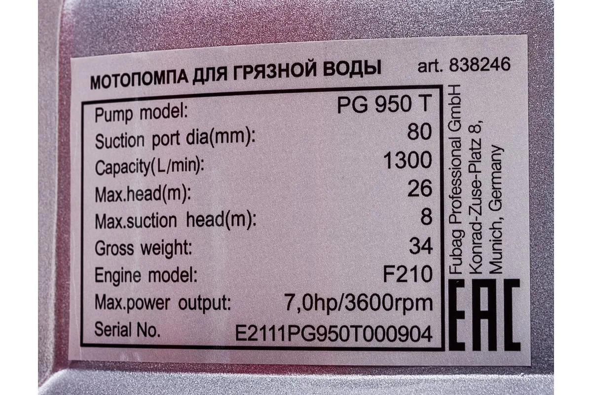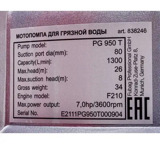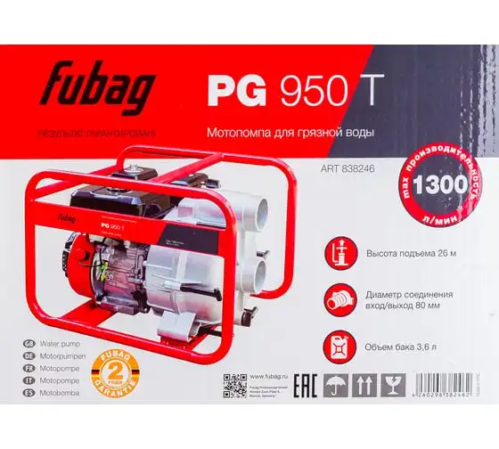 Мотопомпа для сильнозагрязненной воды FUBAG PG 950T 838246 оборудована 4-тактным двигателем мощностью 7 л.с. Предназначена для осушения затопленных сараев или подвалов, пригодится на строительной площадке для осушения котлована. Диаметр твердых включений в перекачиваемой жидкости не должен превышать 30 мм. Благодаря усиленной раме механизм мотопомпы защищен от повреждений. Кроме того, рама гарантирует устойчивое положение агрегата как при использовании, так и при транспортировке. Крыльчатка чугунная. Давление на выходе: 2.6 бар.