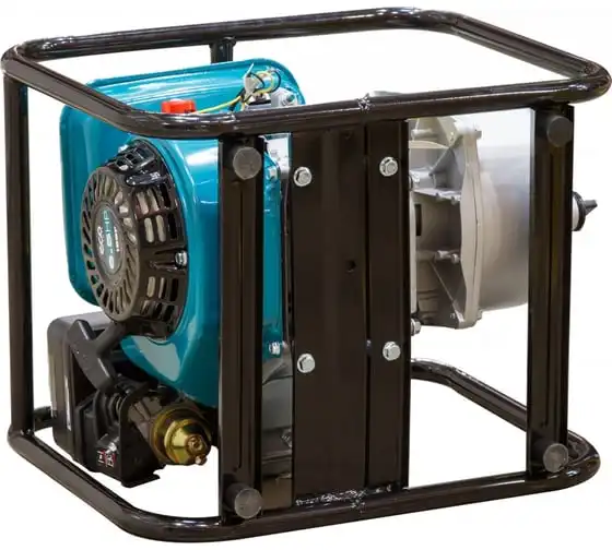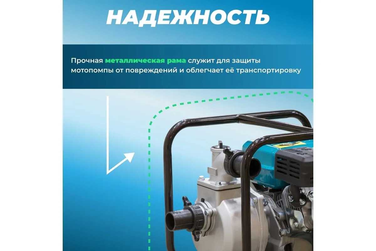 Прочная металлическая рама служит для защиты мотопомпы от повреждений и облегчает её транспортировку.