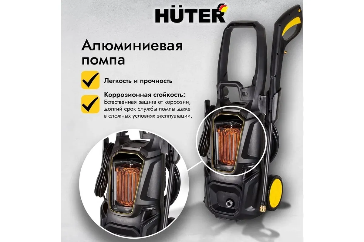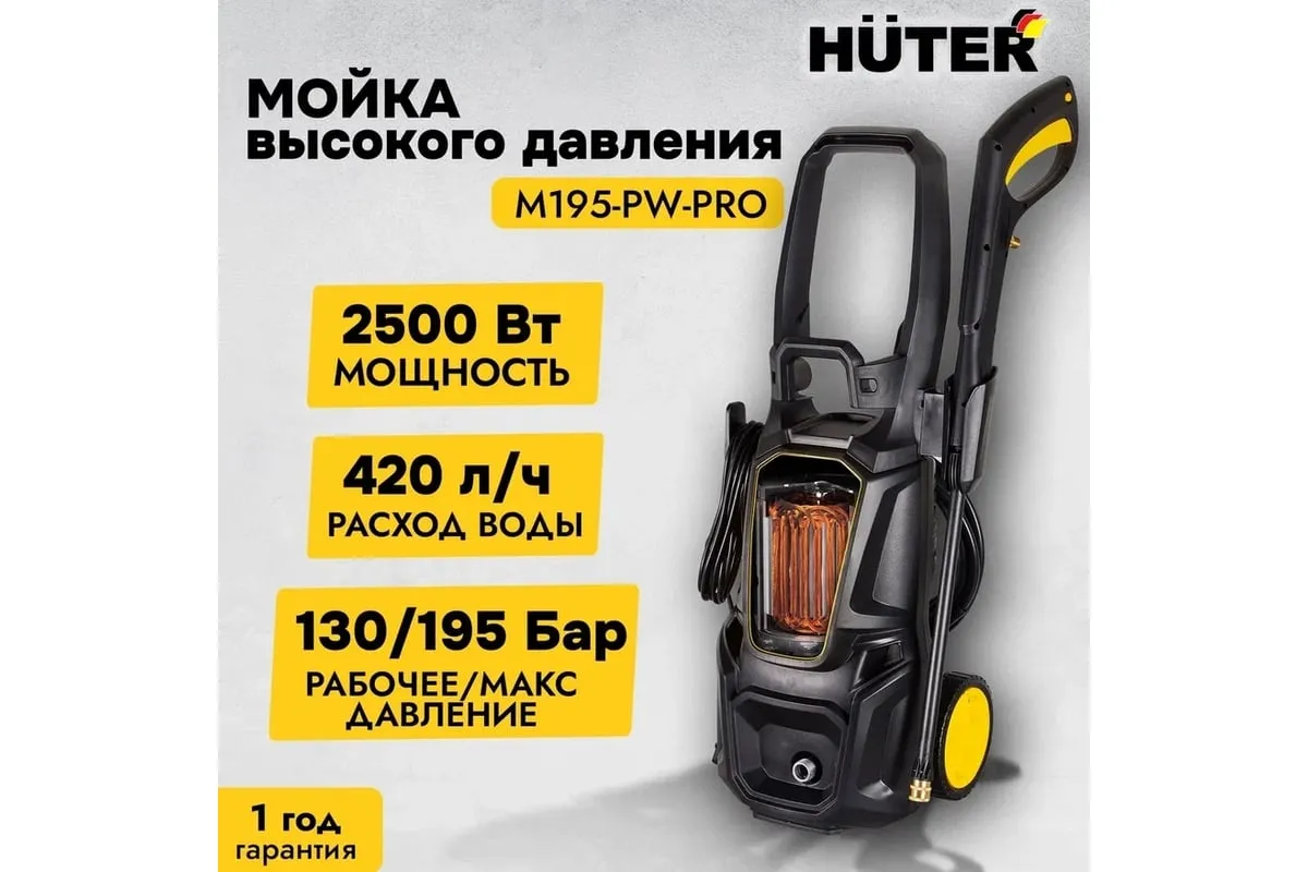 Модель Huter M195-PW-PRO имеет синхронный щёточный двигатель мощностью 2500 Вт. с воздушной системой охлаждения. Рабочее давление мойки - 130 бар, максимальное - 195 бар. Средний расход воды составляет 420 литров в час.