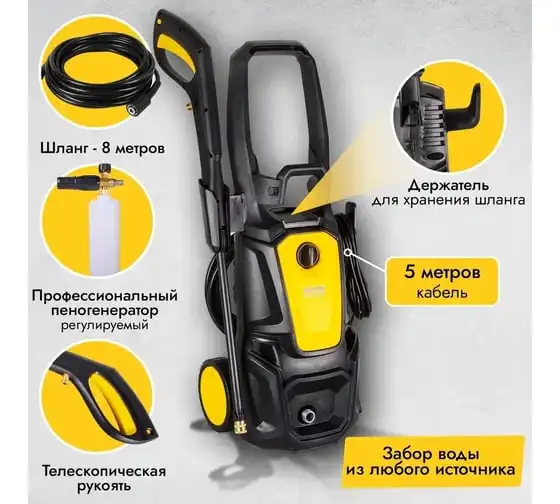Длинный шланг 8 метров позволяет мыть автомобиль без перемещения моечного аппарата. Но если потребуется перенести мойку, то для этого есть удобная пластиковая ручка и колеса.