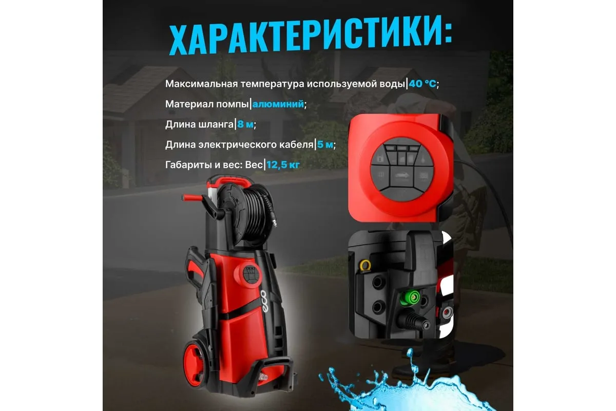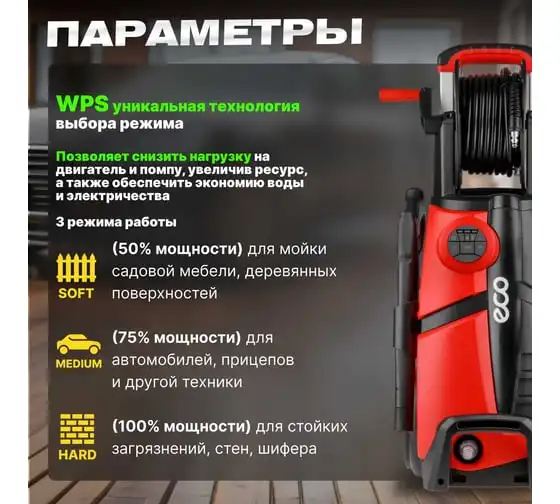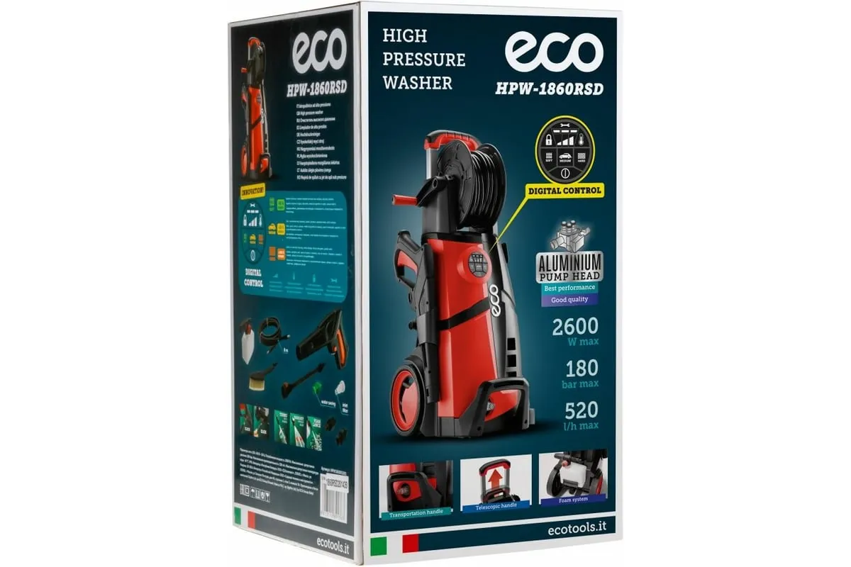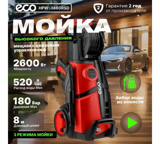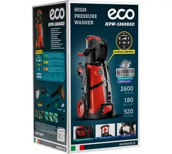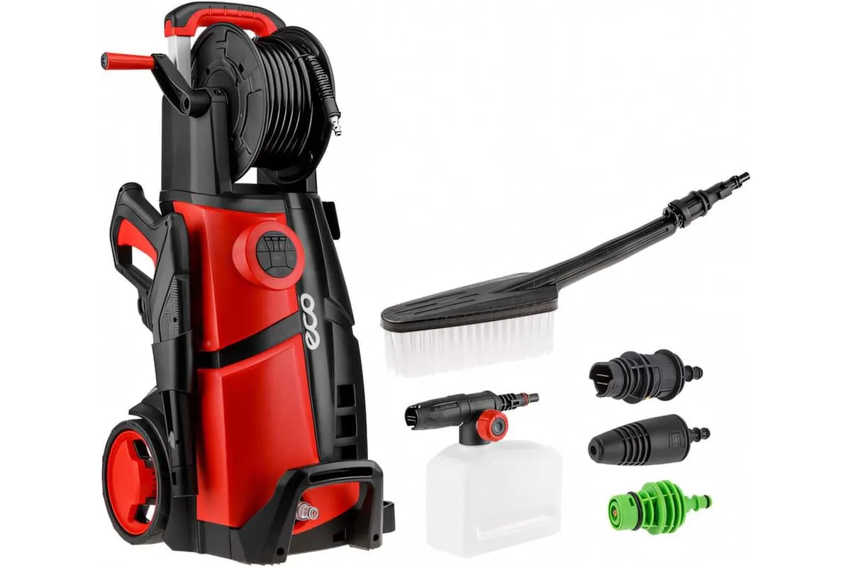 Мойка высокого давления ECO HPW1860RSD01 подходит для очистки садовой мебели, велосипедов, автомобилей, садовых инструментов, стен и фасадов зданий.