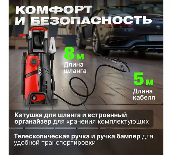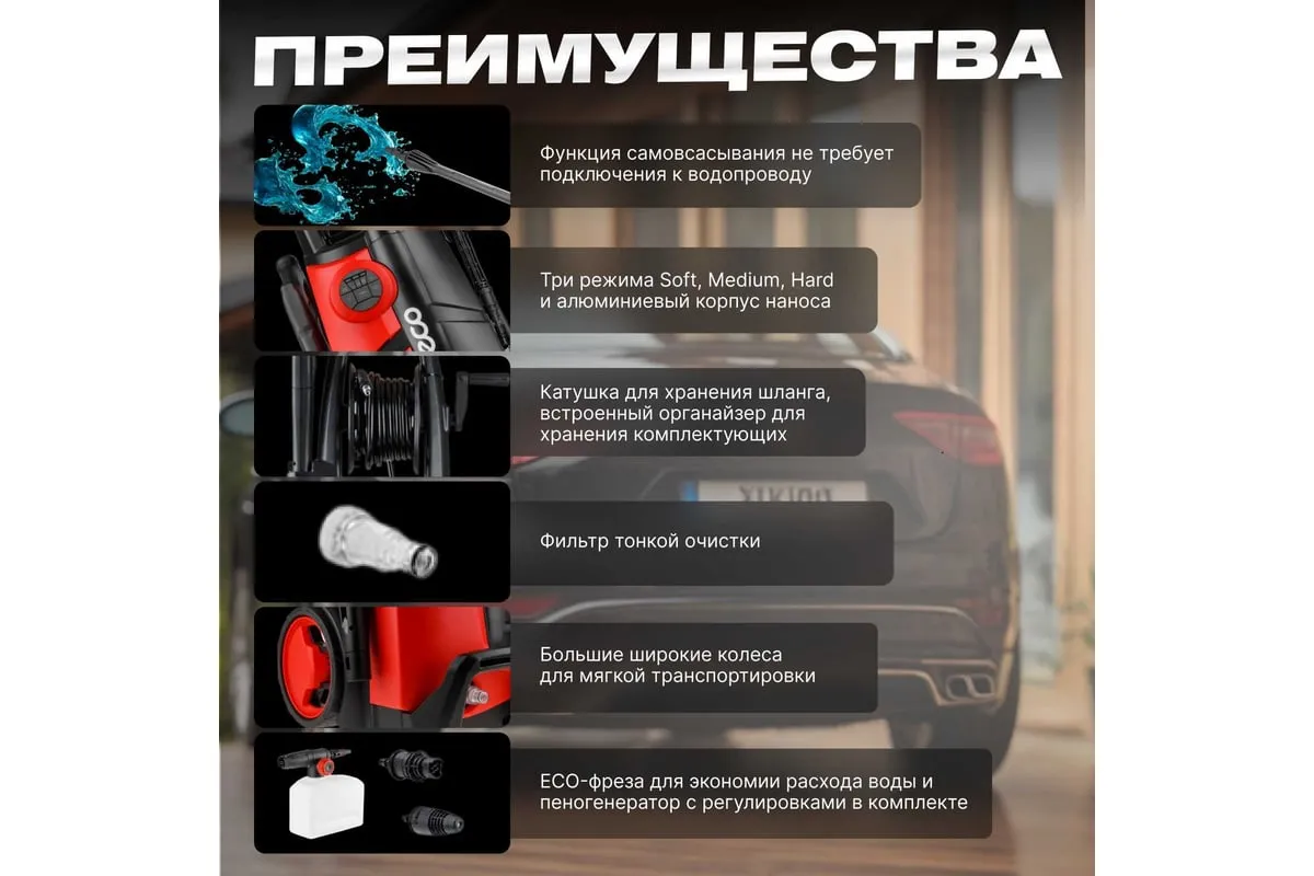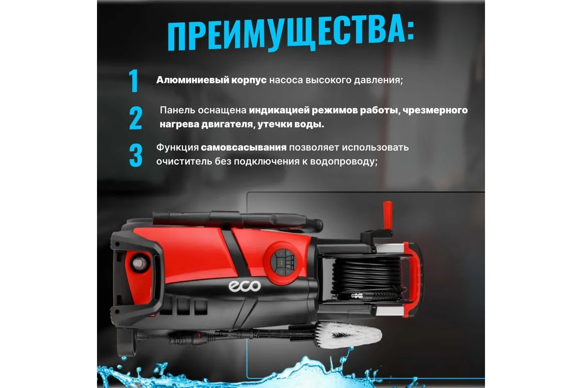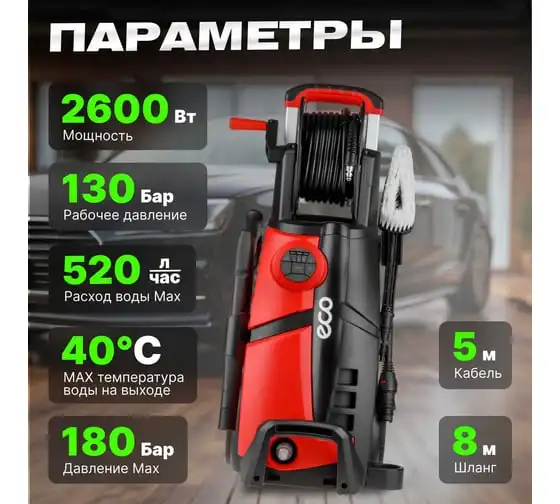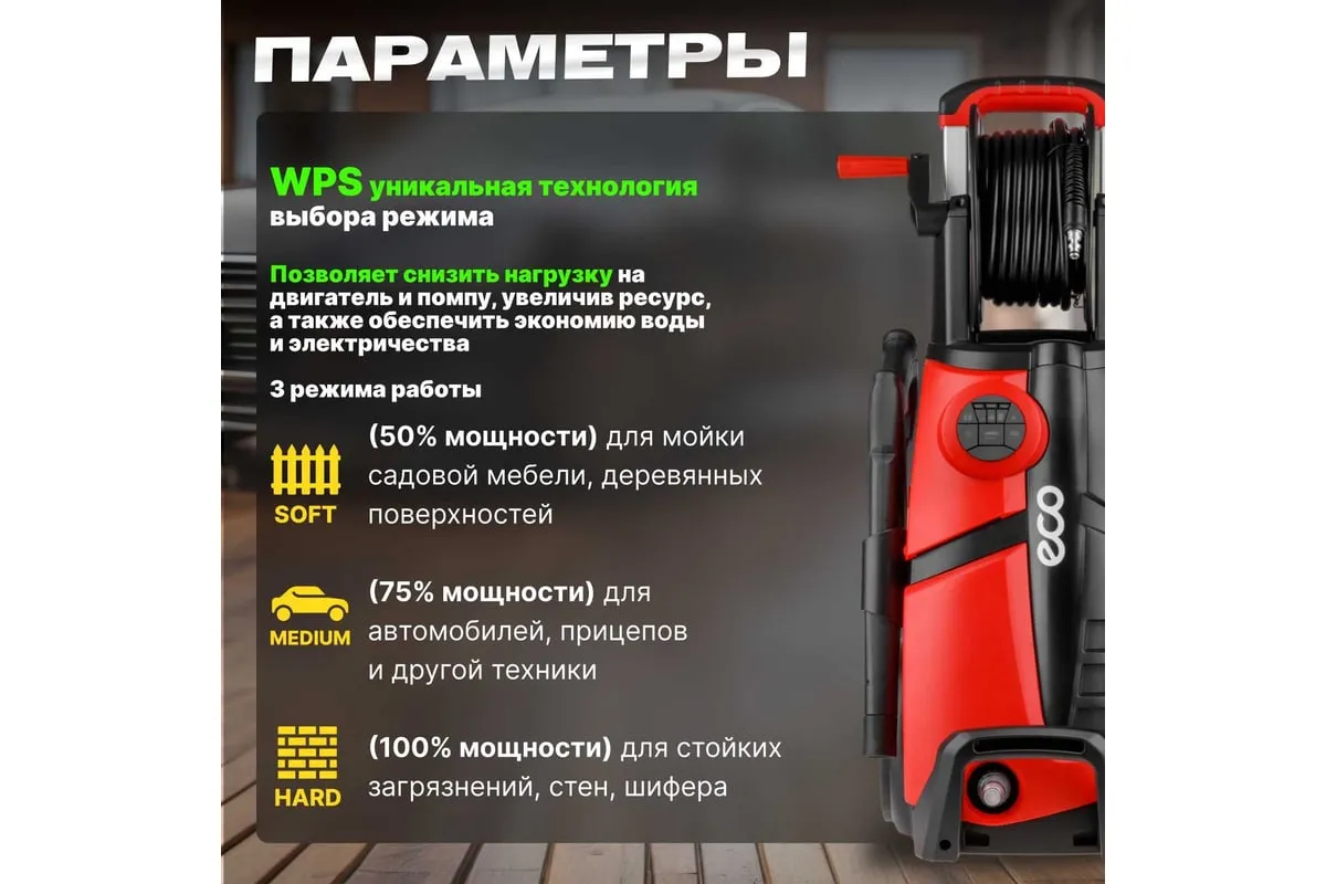 Мойка высокого давления ECO HPW1860RSD01 подходит для очистки садовой мебели, велосипедов, автомобилей, садовых инструментов, стен и фасадов зданий.