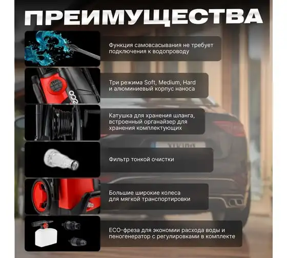 Оснащена тремя режимами работы - Soft, Medium, Hard для работы с различными загрязнениями. Пеногенератор и грязевая фреза обеспечивают дополнительное удобство при работе с сильными загрязнениями.