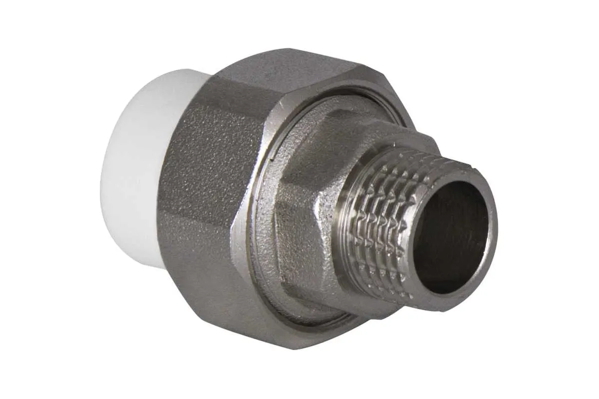 Комбинированные разъемные полипропиленовые фитинги имеют накидную гайку и резьбовую втулку из латуни марки CW617N с никелированным покрытием и служат для получения разъемного соединения. На резьбовой части фитинга имеется шестигранник, за который муфта удерживается при затяжке. Герметичность разъемного соединения достигается благодаря плоскому уплотнительному кольцу из EPDM.