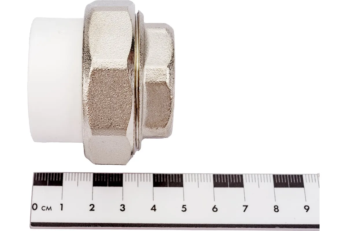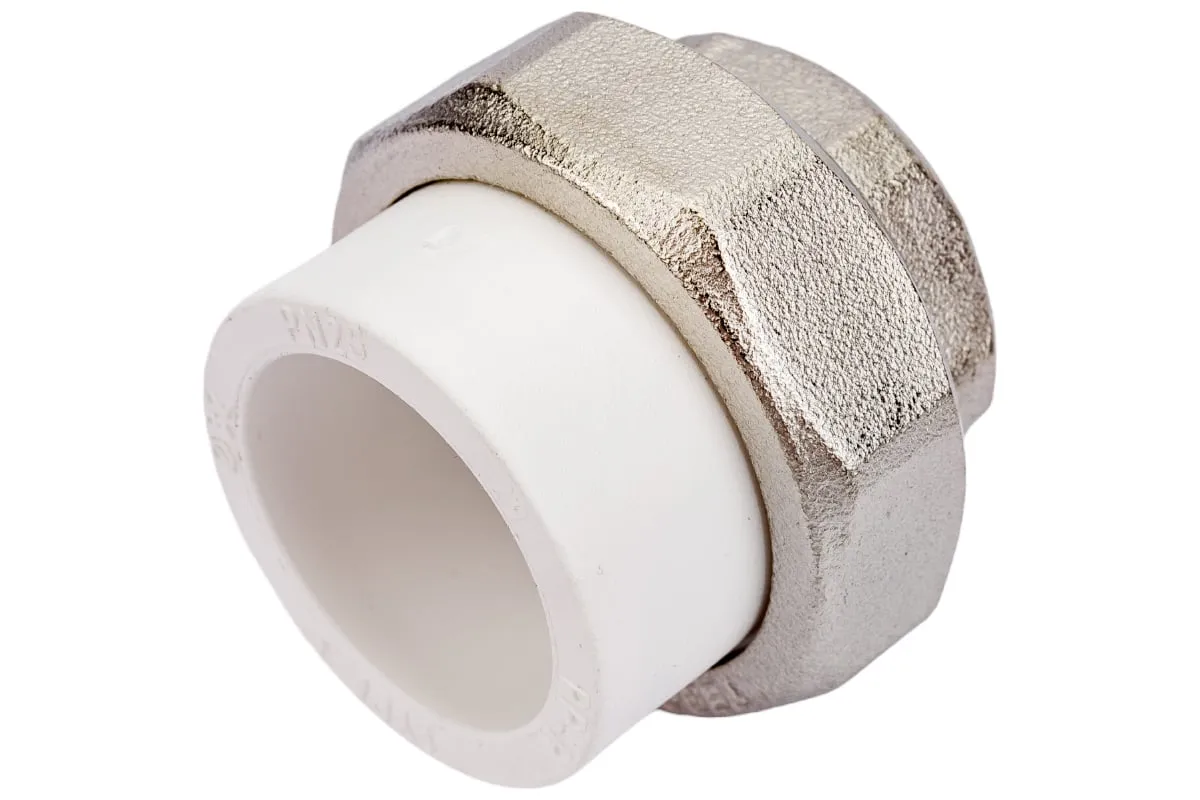Комбинированные разъемные полипропиленовые фитинги имеют накидную гайку и резьбовую втулку из латуни марки CW617N с никелированным покрытием и служат для получения разъемного соединения. На резьбовой части фитинга имеется шестигранник, за который муфта удерживается при затяжке. Герметичность разъемного соединения достигается благодаря плоскому уплотнительному кольцу из EPDM.