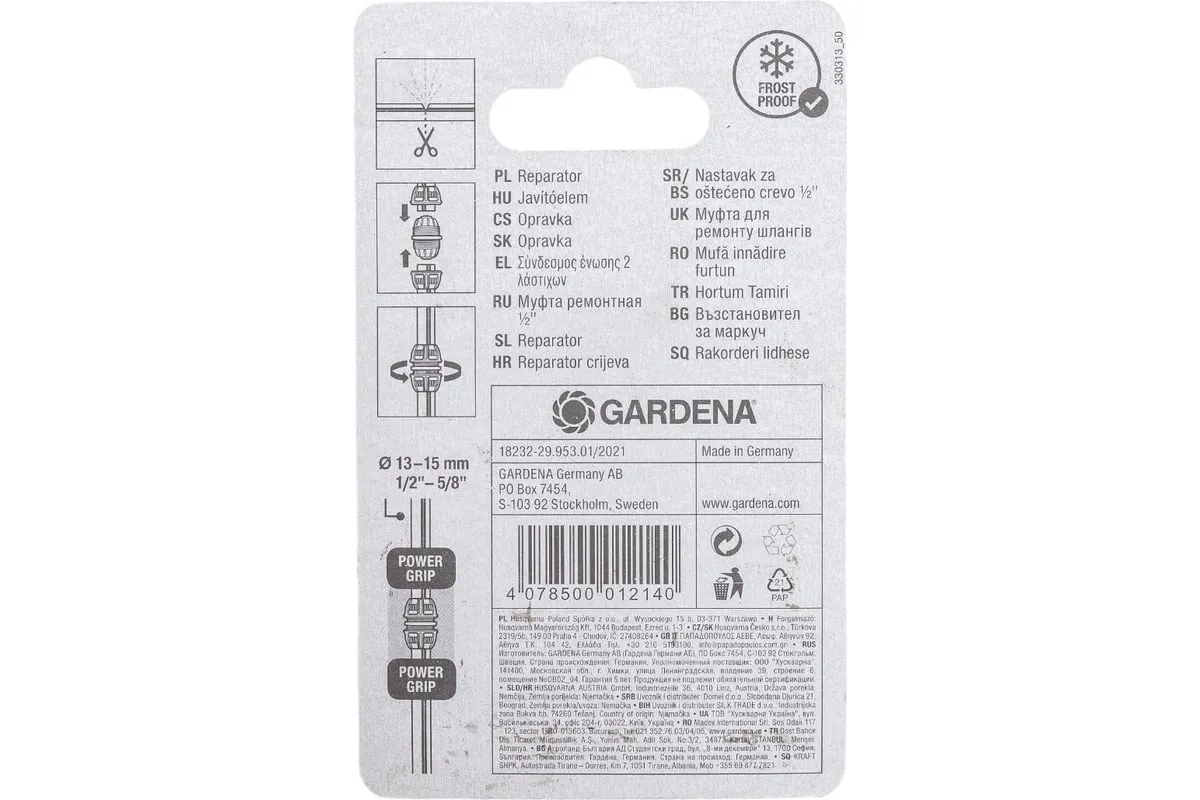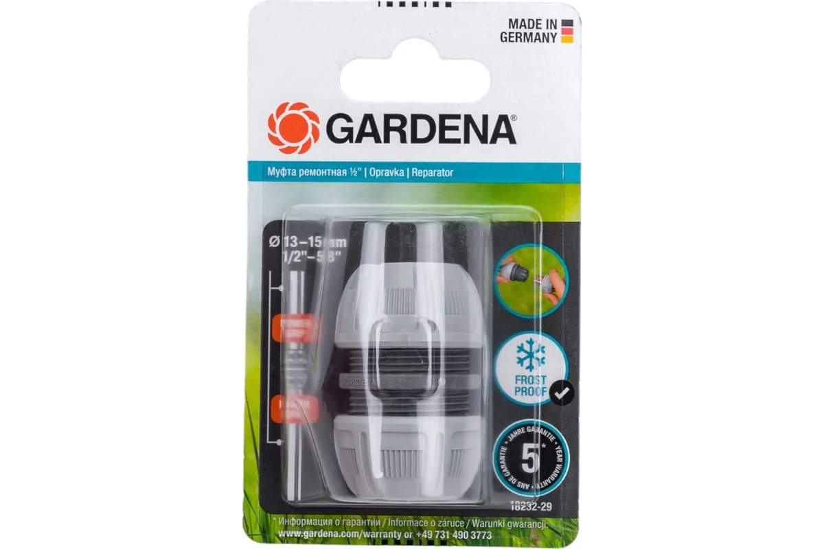 Муфта ремонтная 1/2" Gardena 18232-29.000.00 - принадлежность для легкого ремонта шлангов диаметром 13 мм. Концы поврежденного шланга надежно фиксируются муфтой благодаря наличию усиленных затяжных гаек. При помощи муфты можно быстро восстановить систему полива.