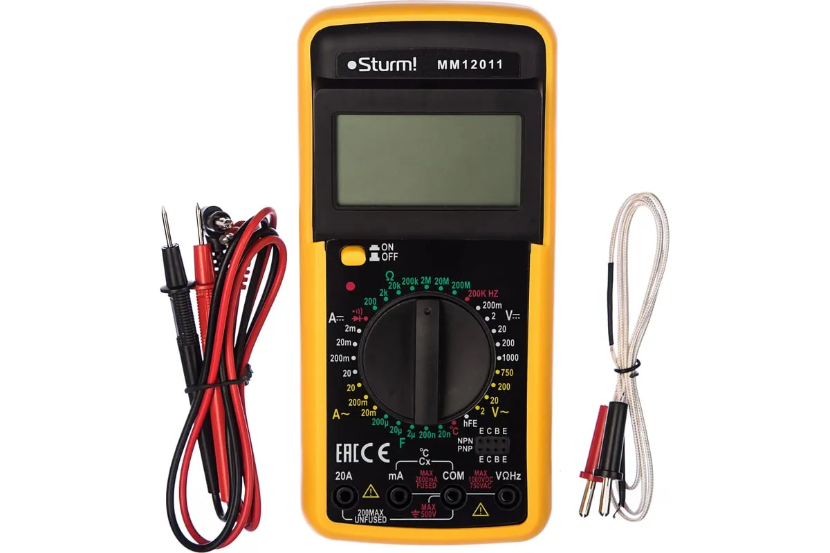 Мультиметр Sturm MM12011 - это многофункциональный прибор, предназначенный для измерения переменного/постоянного напряжения, постоянного/переменного тока, сопротивления, емкости, частоты и температуры. Он прост и удобен в обращении благодаря небольшим габаритам и малому весу. Кроме основных функций устройство обладает возможностью проверки диода и прозвонки цепи, что расширяет область его применения. Полученные измерения отображаются на хорошо читаемом ЖК-дисплее.