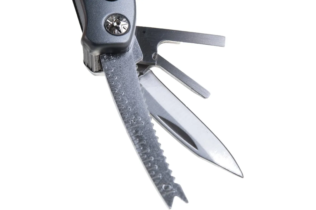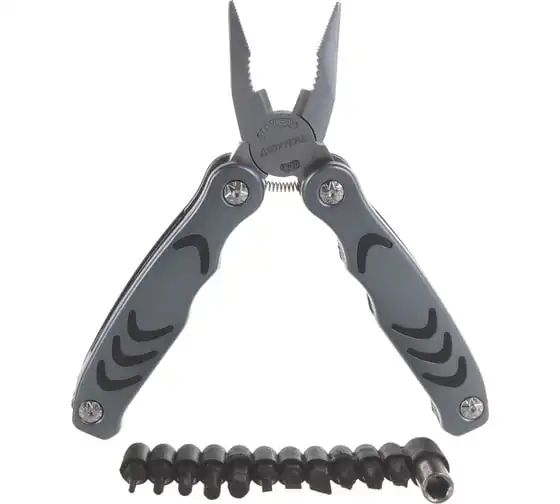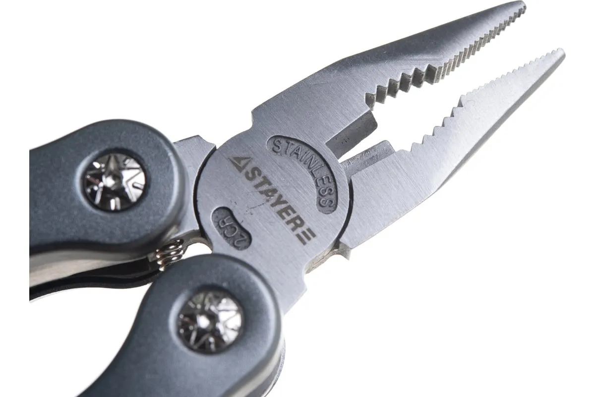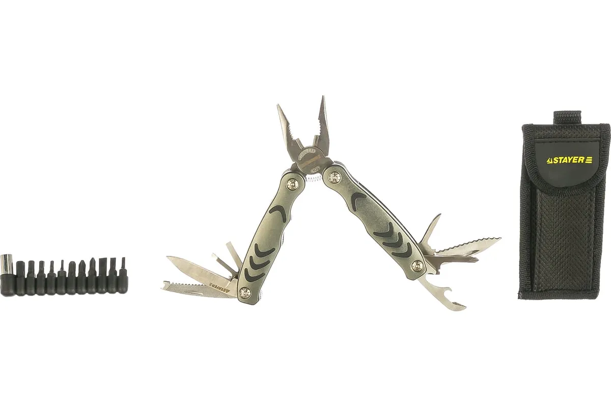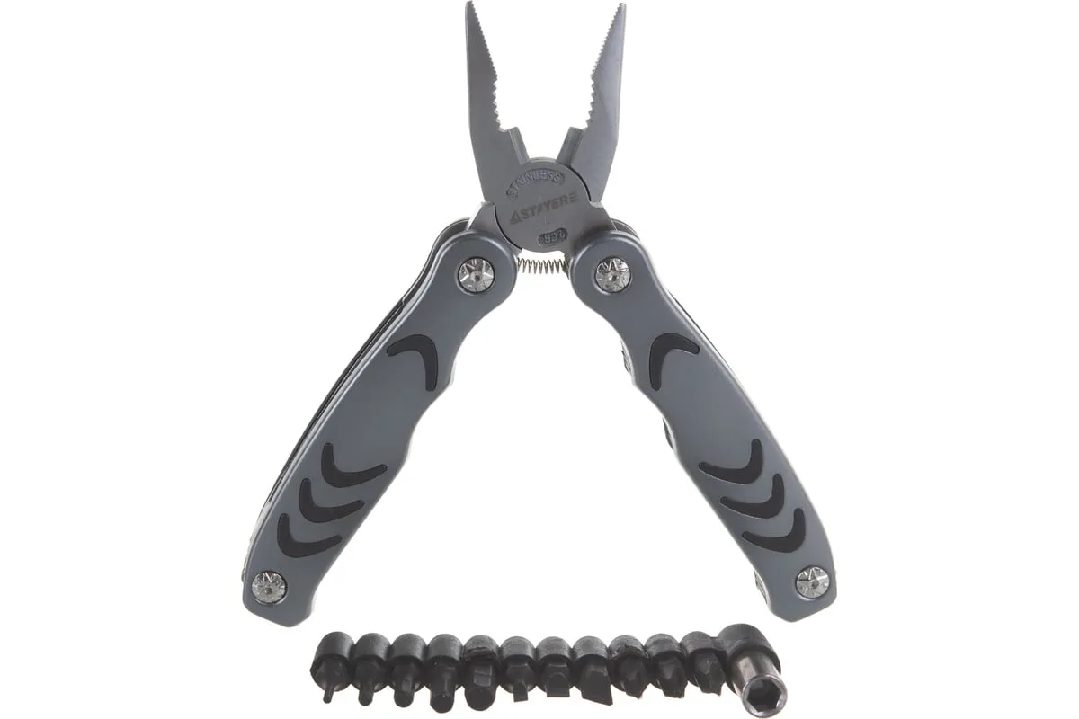 Многофункциональный инструмент PROFESSIONAL 12 в 1 STAYER 22852_z01 - это незаменимый инструмент, который выполняет функции 12 инструментов, таких как плоскогубцы, кусачки, нож, отвёртка, открывалка, напильник. Он компактный и лёгкий, поэтому его удобно брать с собой на пикники, охоту и рыбалку. Инструмент изготовлен из нержавеющей инструментальной стали. К нему прилагается 11 бит и адаптер.