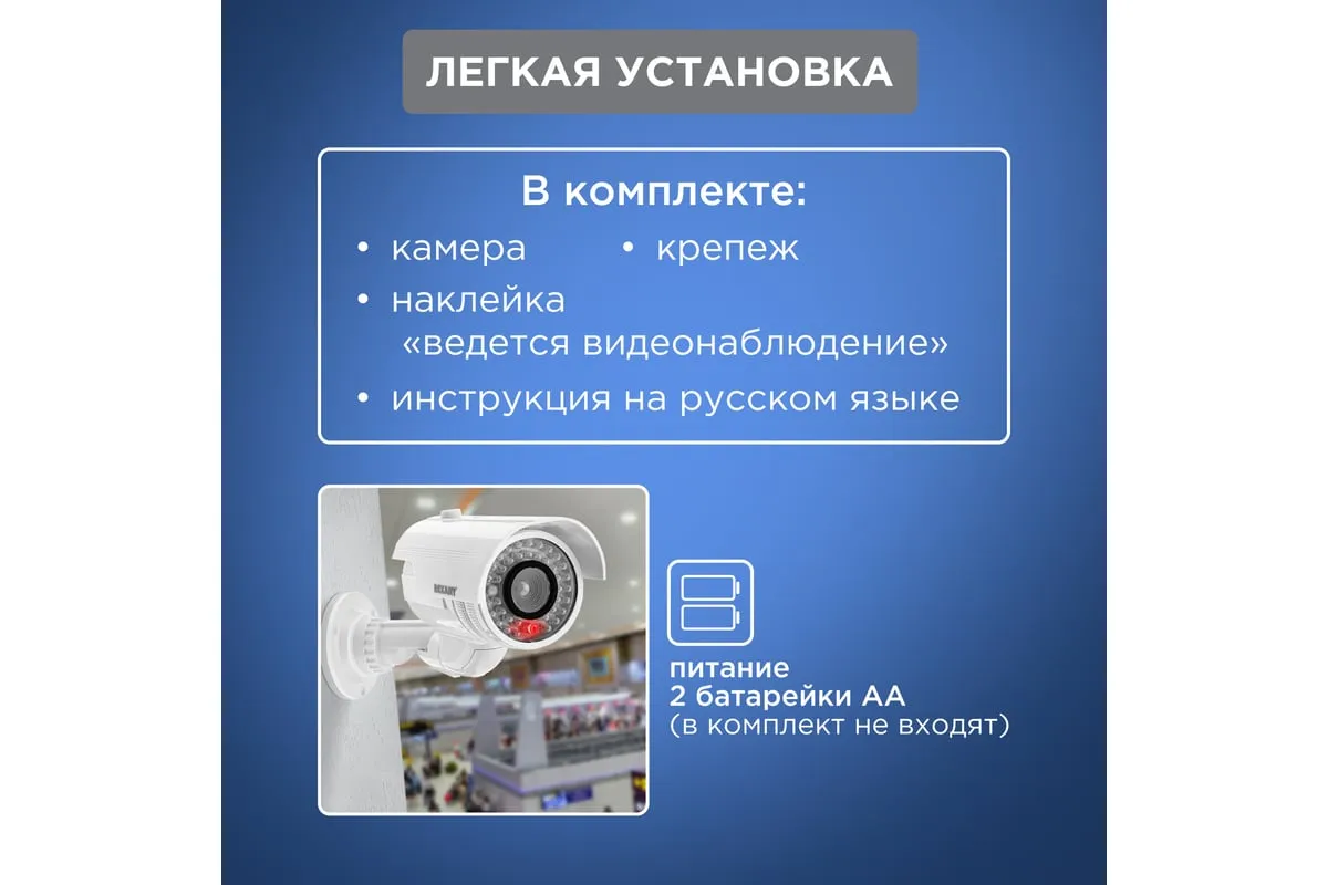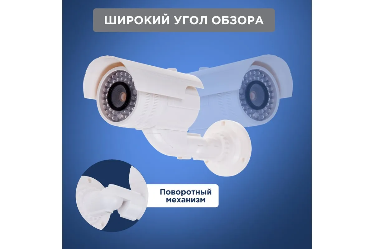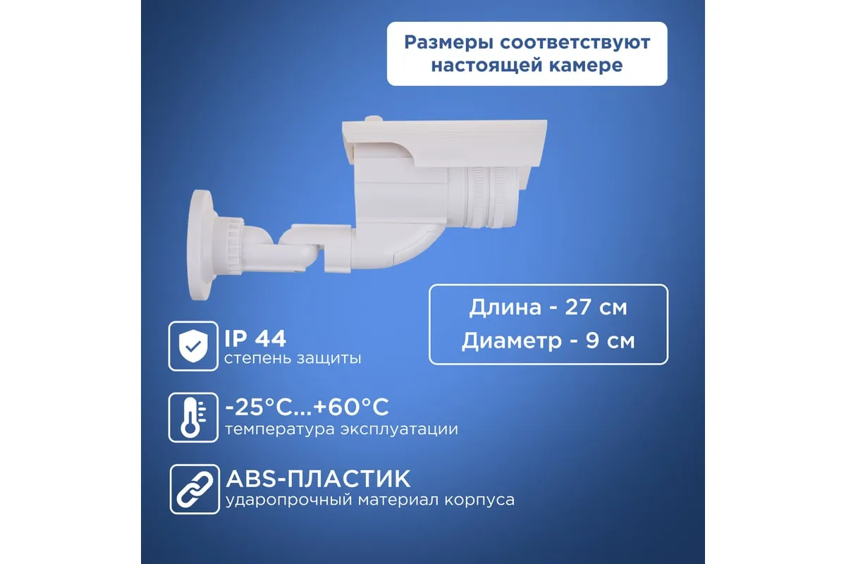 Мигающий красный светодиод создаст видимость работы камеры. Муляж фиксируется на фасад загородного дома или здания. Работает от двух батареек АА.