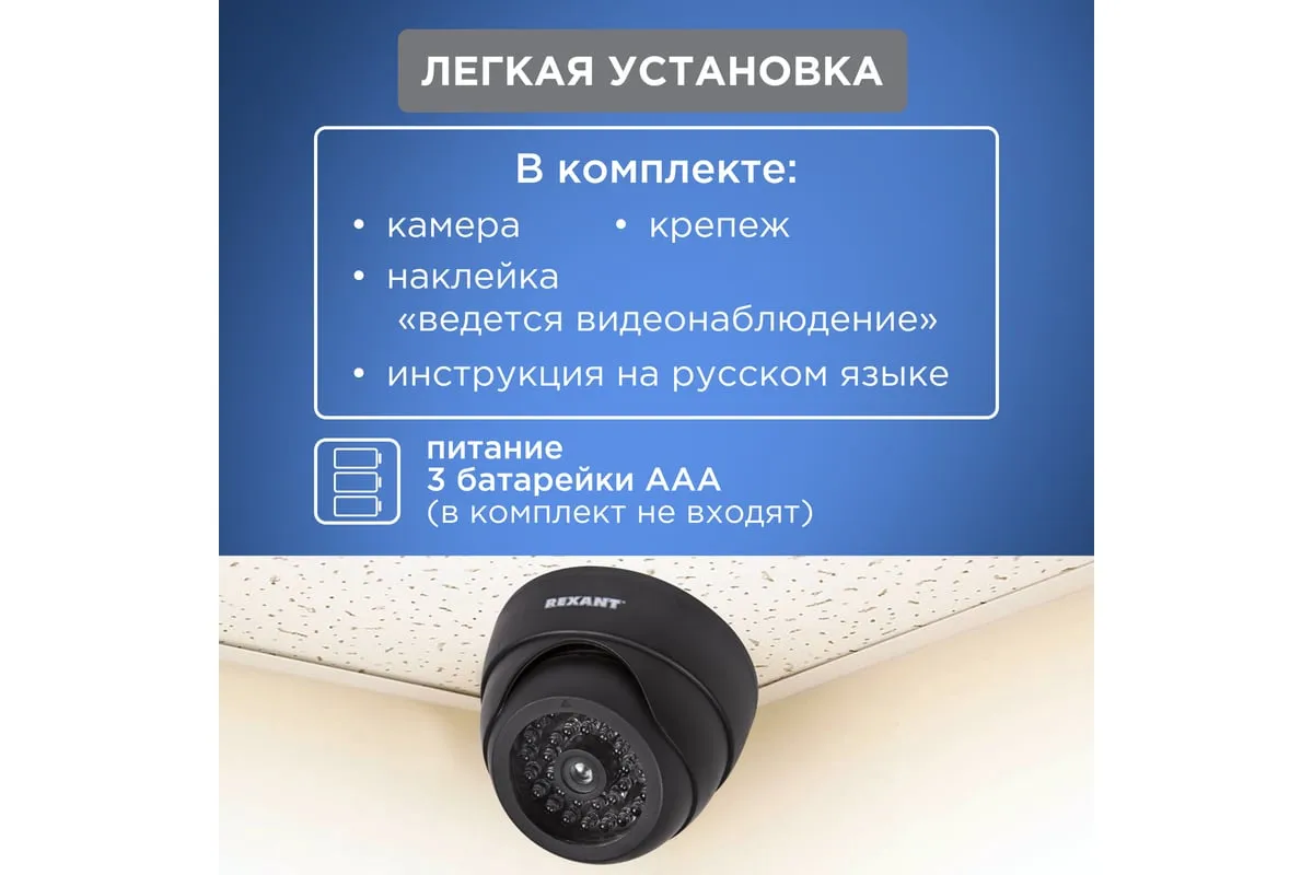 Мигающий красный светодиод создаст видимость работы камеры. Для работы потребуется три батарейки ААА.