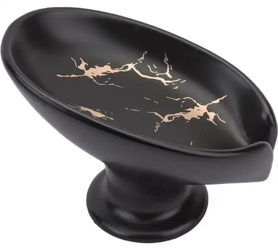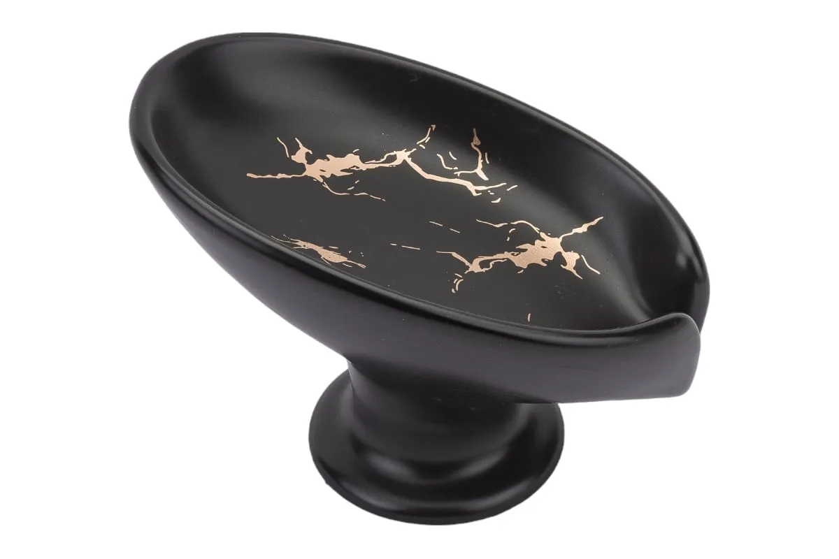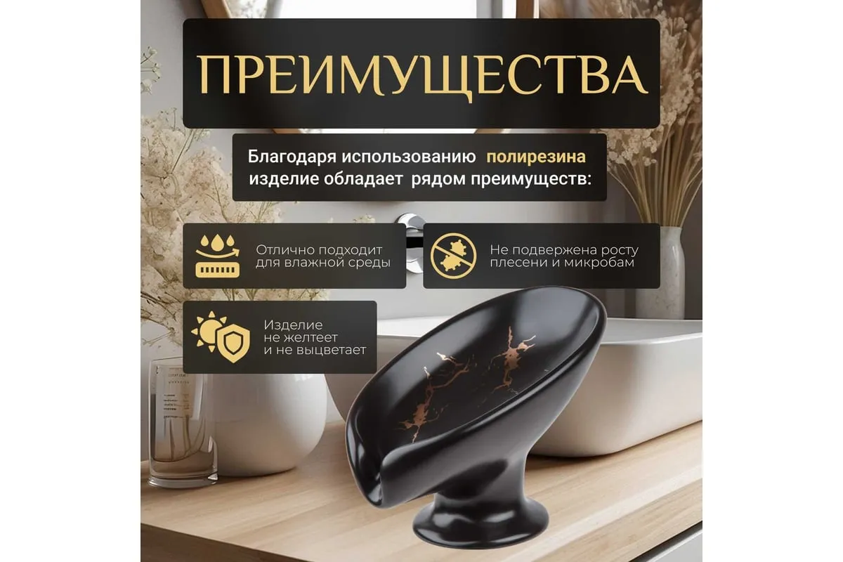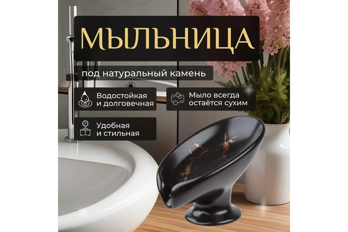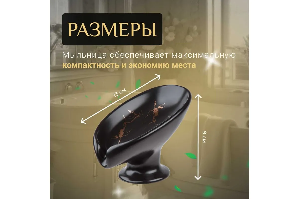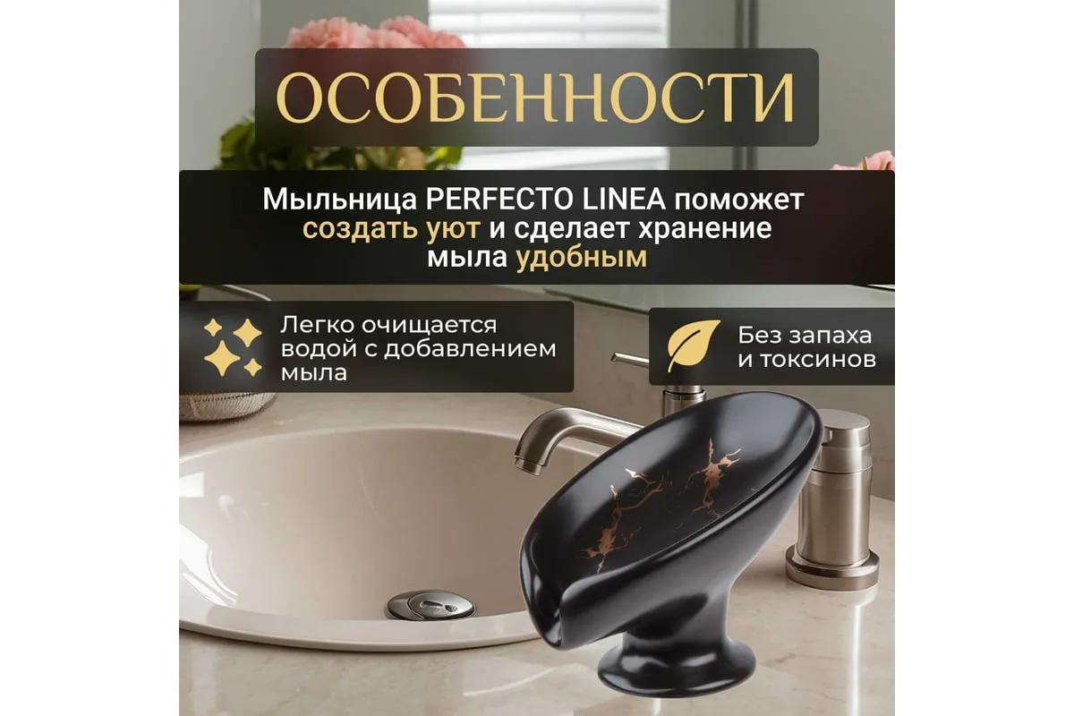 Мыльница PERFECTO LINEA Elegance черная 35-113891 выполнена в форме лепестка под наклоном и имеет слив, благодаря чему вода стекает в раковину, а мыло остается сухим и не растворяется. Держатель для мыла также можно использовать как держатель для губок на кухне.
