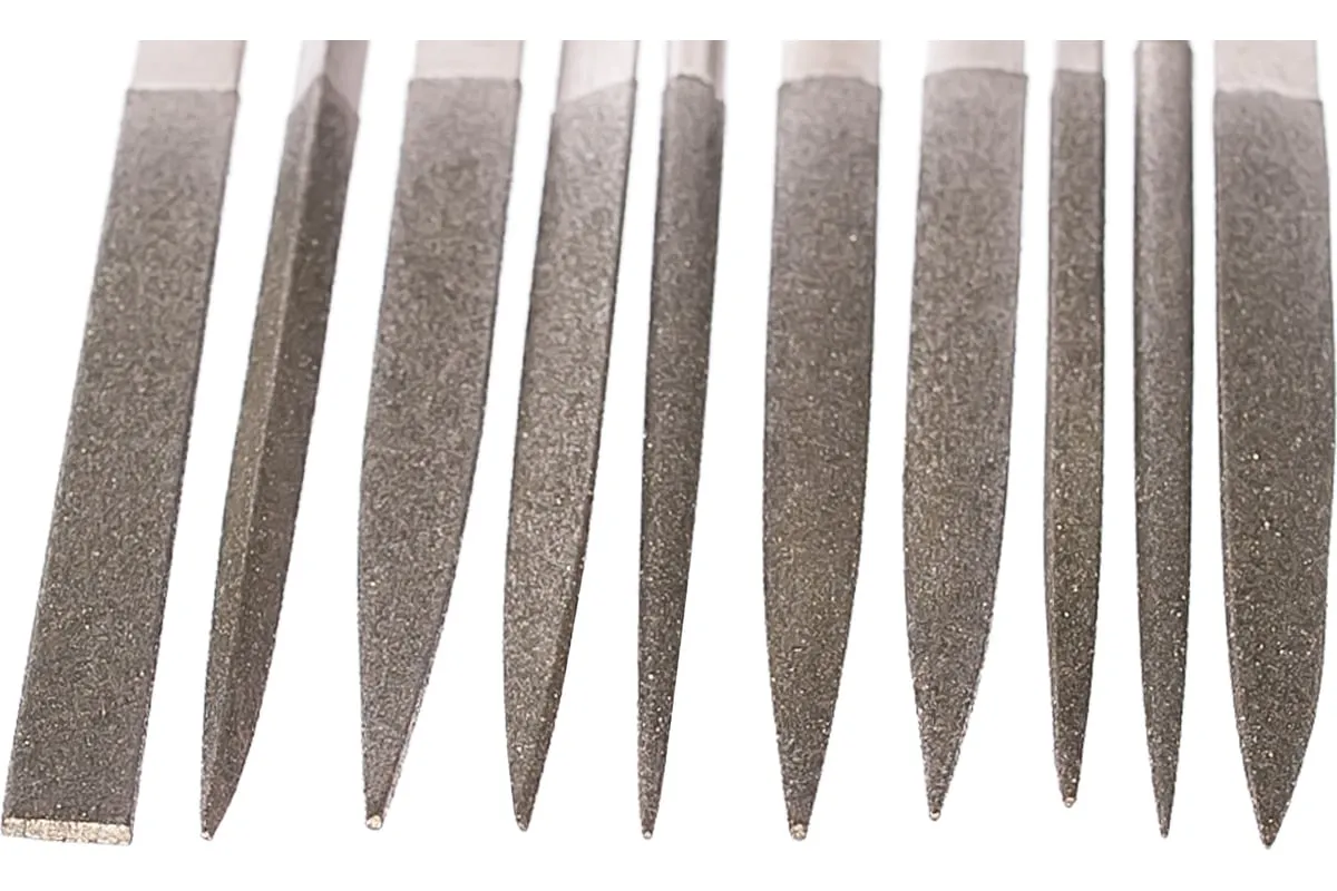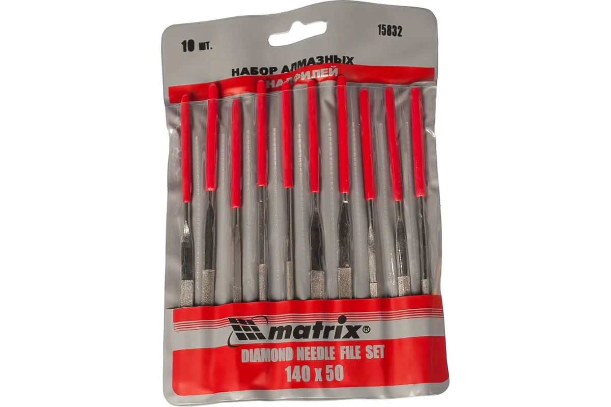 Набор алмазных надфилей 10 шт. MATRIX 15832 применяется для ручной обработки поверхностей из различных твердых материалов. На рабочую часть нанесено алмазное покрытие, что увеличивает износостойкость и срок службы инструмента. Пластмассовые ручки способствуют комфортной работе и предотвращают выскальзывание из рук.