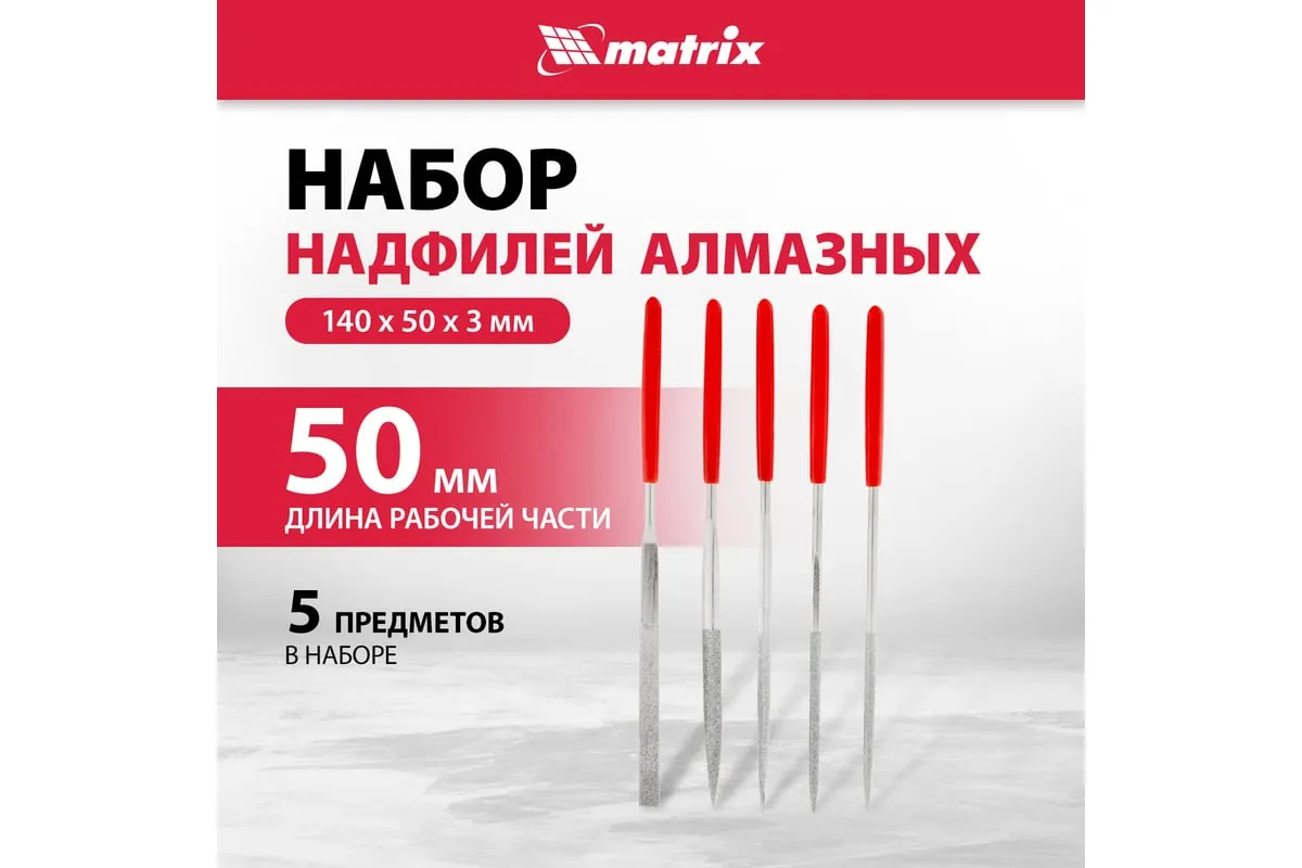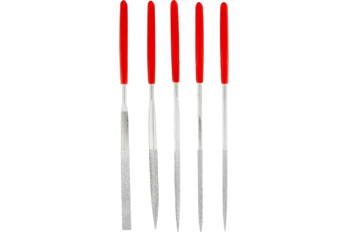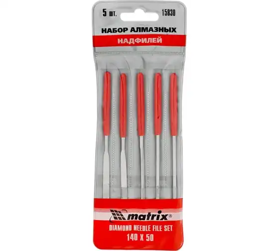Набор алмазных надфилей 140х50х3, 5 шт MATRIX 15830 - это комплект ручных инструментов, состоящий из пяти компонентов, который применяется для выполнения небольших слесарных работ с заготовками из особо твердых материалов, таких как: металлы, керамическая плитка, стекло и пр. Инструменты очень удобны в применении, так как обладают пластиковыми ручками. Надфили прослужат долгий срок за счет использования прочных материалов и алмазного напыления.