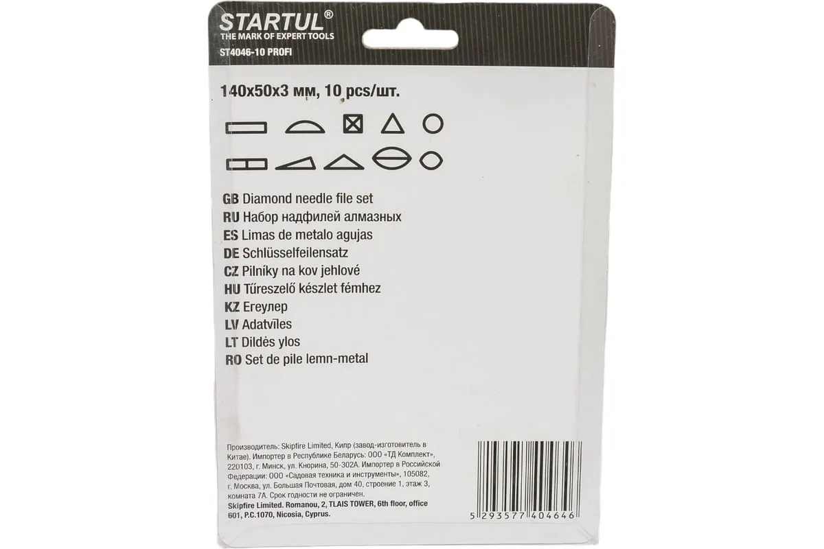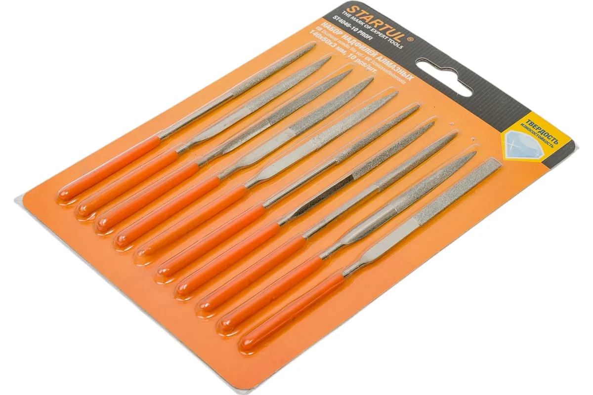 Набор алмазных надфилей STARTUL Profi 140x50x3мм, 10 предметов ST4046-10 предназначен для выполнения мелких слесарных работ. Надфили выполнены из высококачественной стали. Напыление из алмазной крошки позволяет работать с особо твердыми материалами. Эргономичные рукоятки из ПВХ обеспечивают комфортную эксплуатацию.
