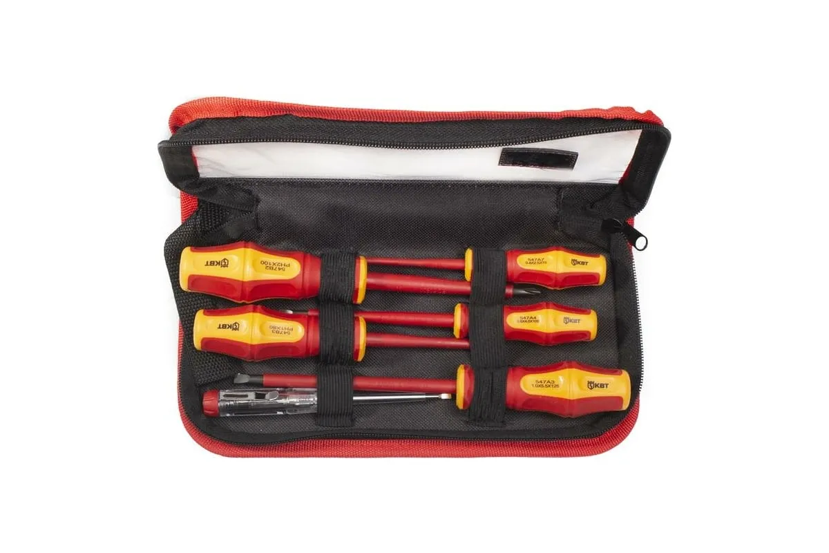 Набор диэлектрических отверток КВТ "Профи" НИО-06-S 87129 поставляется в прочном и удобном чехле на молнии. С его помощью можно безопасно переносить инструмент.