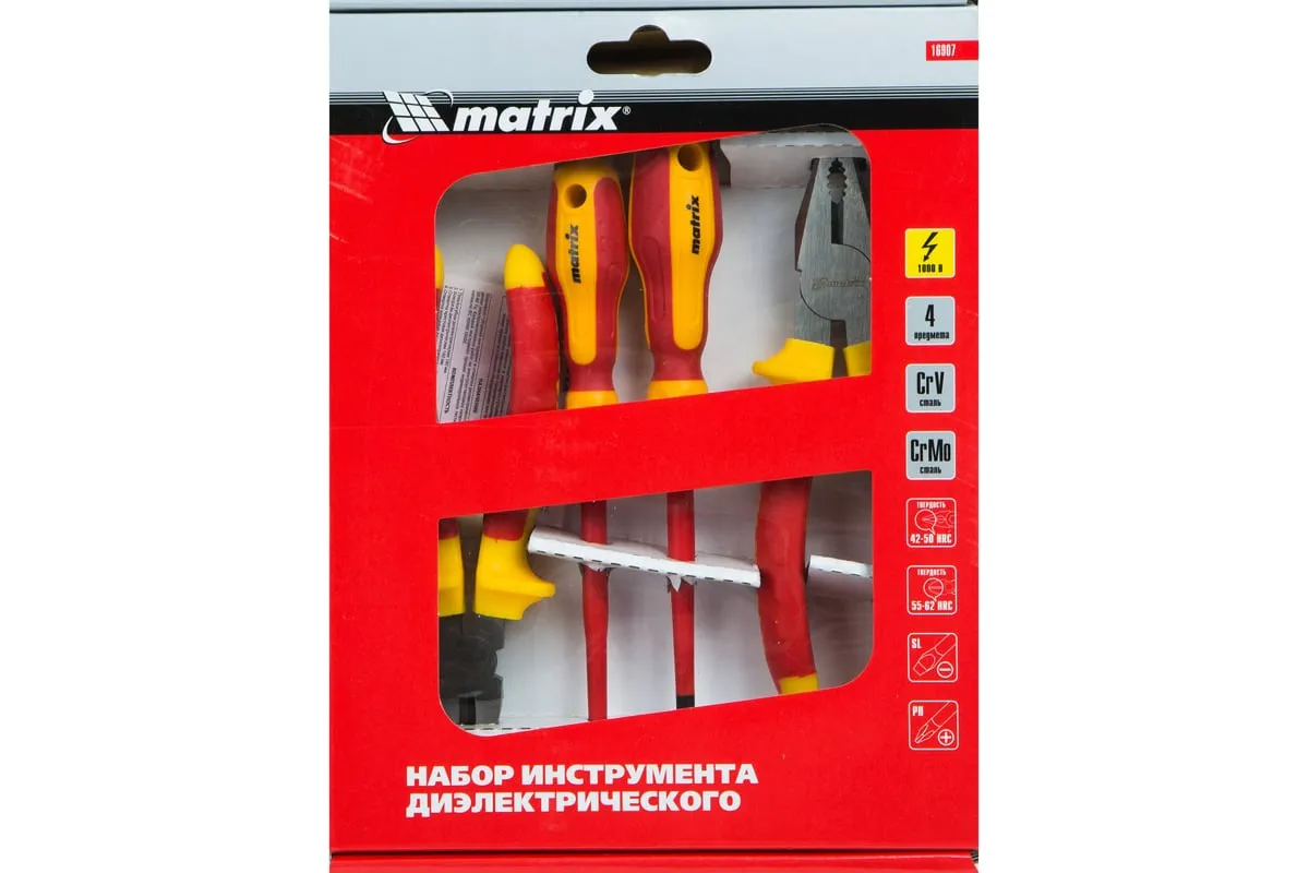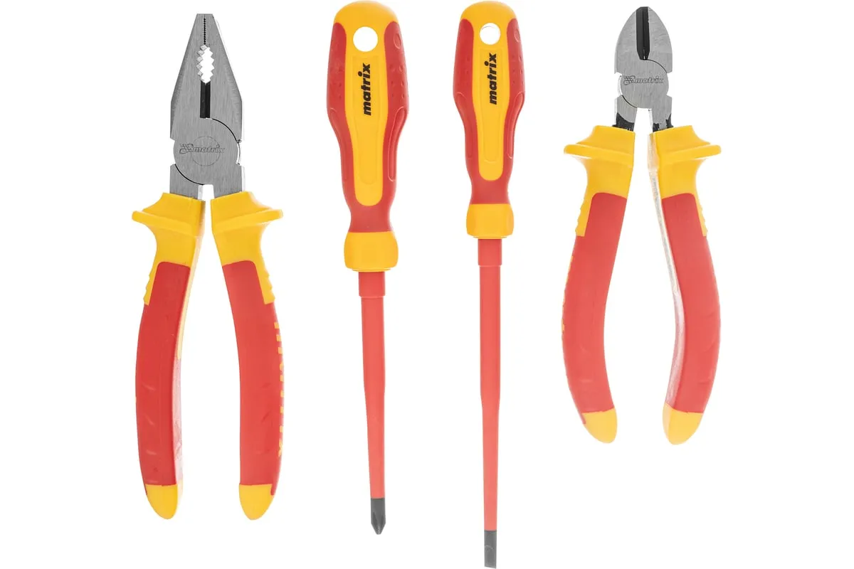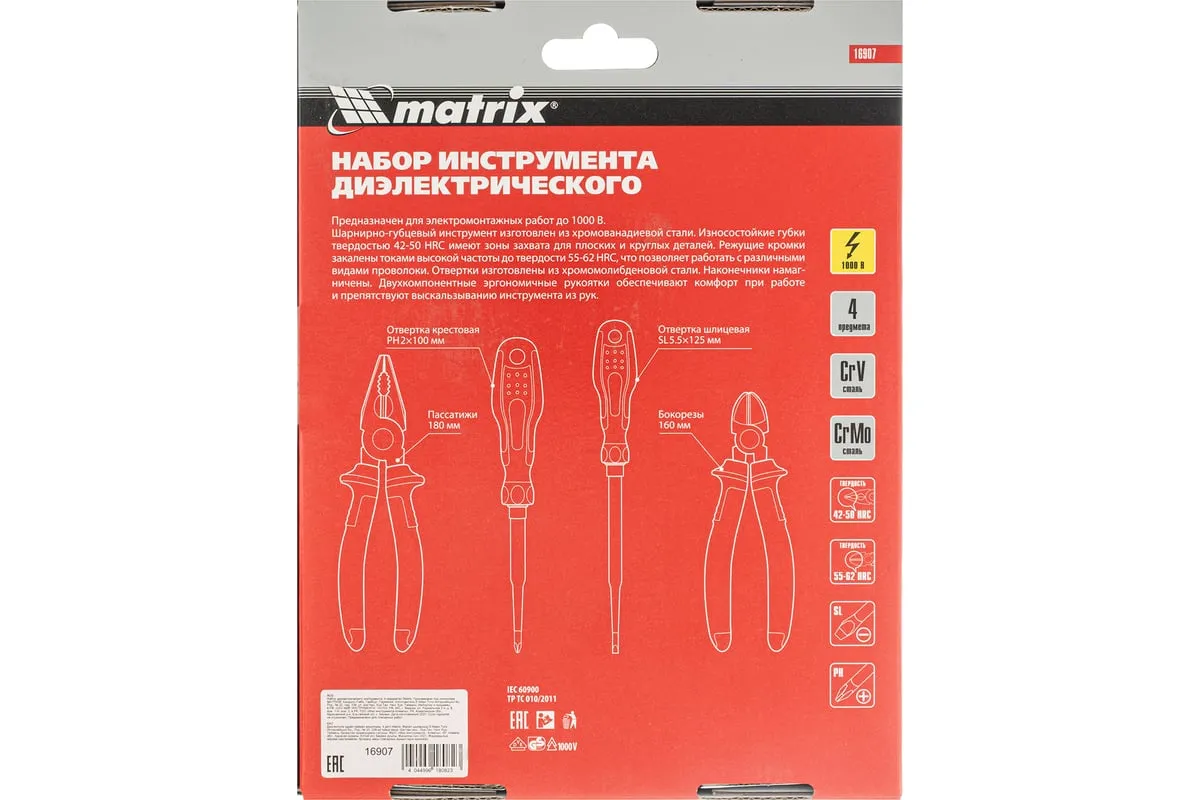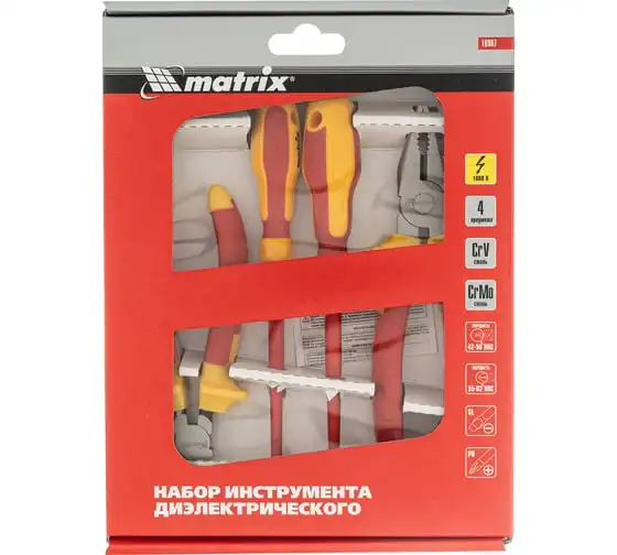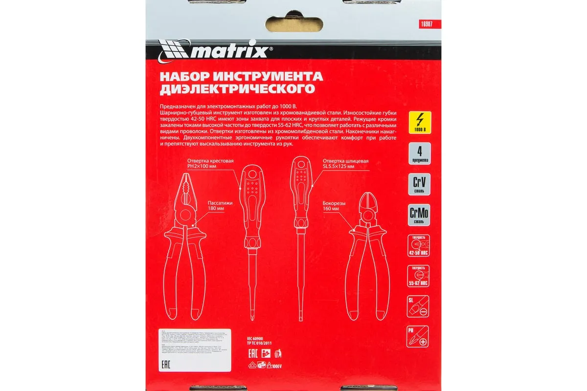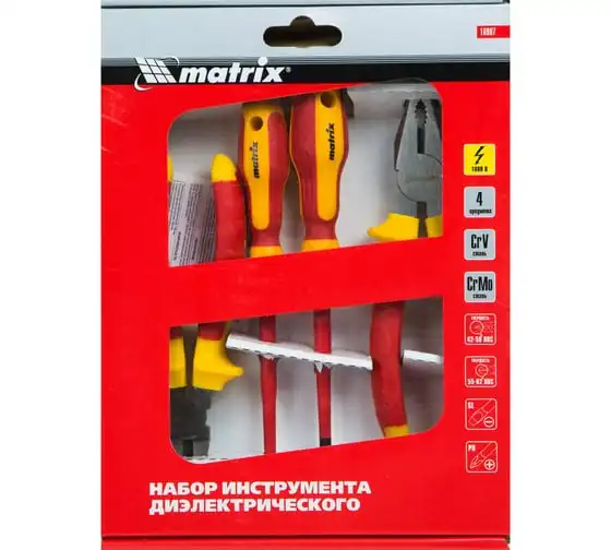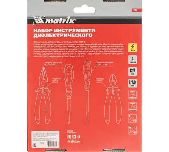 Предназначен для электромонтажных работ до 1000 В.Щарнирно-губцевый инструмент изготовлен из хромованадиевой стали.Износостойкие губки твердостью 42-50 HRС имеют зоны захвата для плоских и круглых деталей.Режущие кромки закалены токами высокой частоты до твердости 55-62 HRC, что позволяет работать с различными видами проволоки.Отвертки изготовлены из хромомолибденовой стали. Наконечники намогничены.Двухкомпонентные эргономичные рукоятки обеспечивают комфорт при работе и препятствуют выскальзыванию инструмента из рук.КомплектацияОтвертка крестовая РН2х100 ммОтвертка шлицевая SL5,5х125 ммПассатижи 180 ммБокорезы 160 мм.