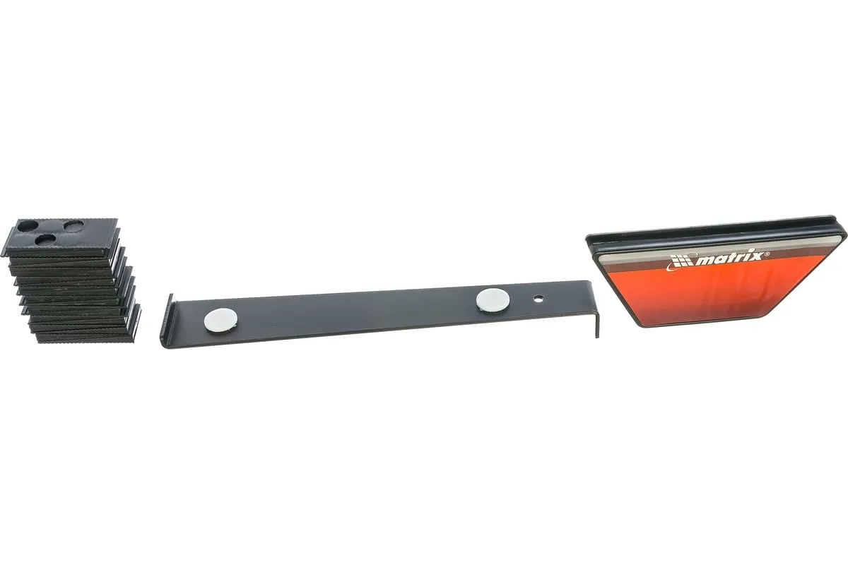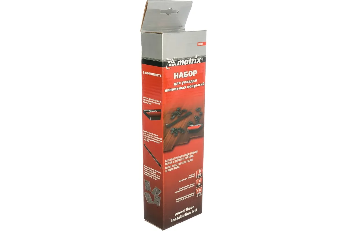 Набор Matrix 88100 используется для правильной укладки напольных покрытий. С его помощью можно гораздо быстрее установить ламинат и при этом получить качественный результат без дефектов и повреждений. Набор включает все необходимое для монтажа: брусок, скобу и распорные клинья. Клинья обеспечивают точность выравнивания первого ряда и возможность регулировки зазора между панелями и стеной. Скоба позволяет подбить последний ряд для плотной усадки. Брусок защищает замок панелей, если нужно подбить стыки молотком.