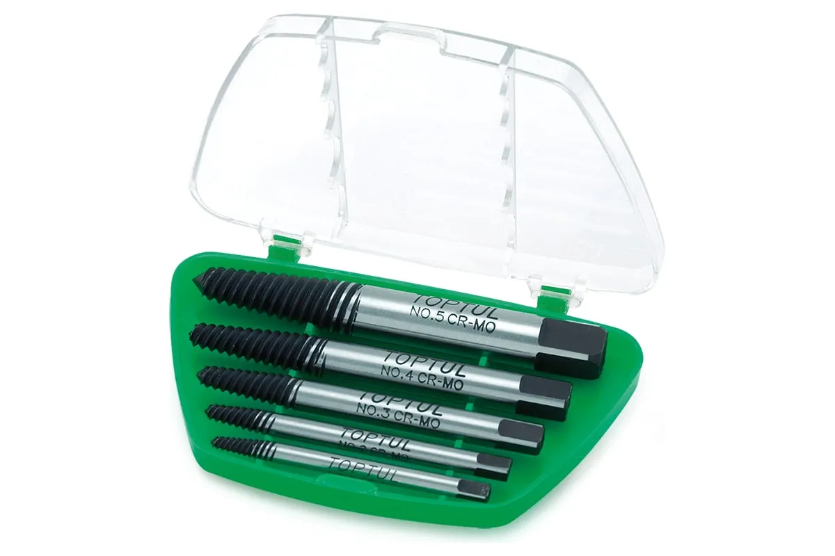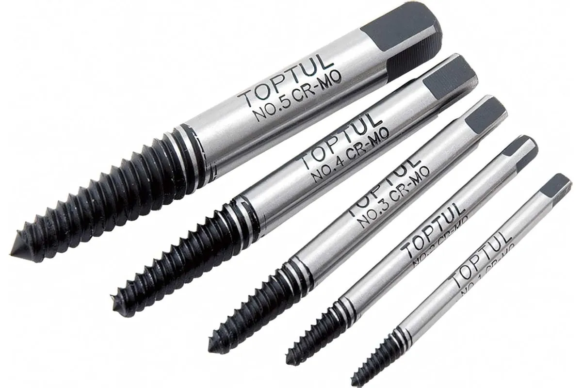 Набор экстракторов TOPTUL 5 предметов JGAW0501 предназначен для извлечения сломанных шпилек, болтов, винтов с головкой под торцевой ключ и других крепежных изделий