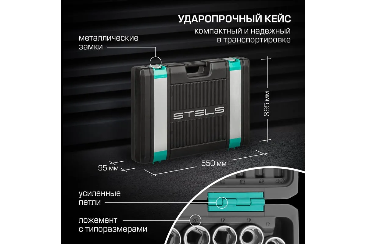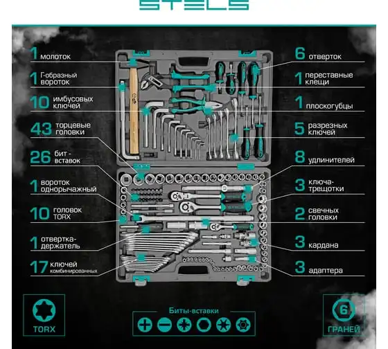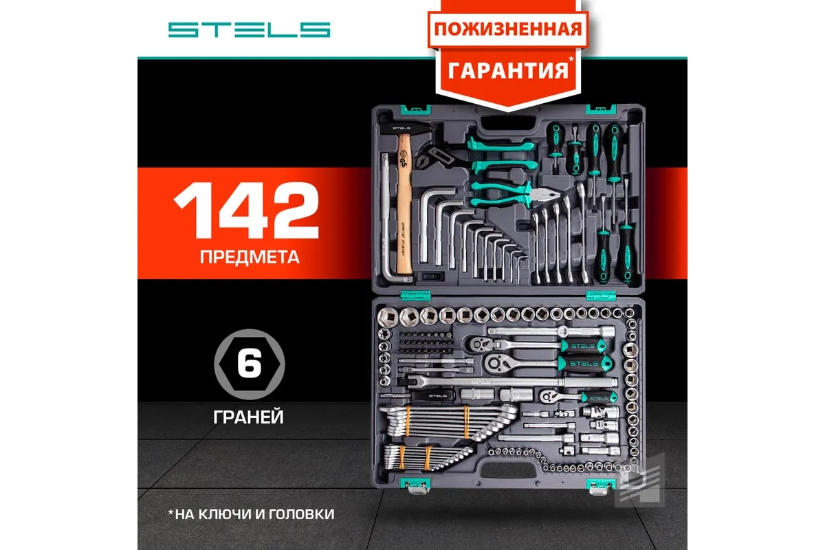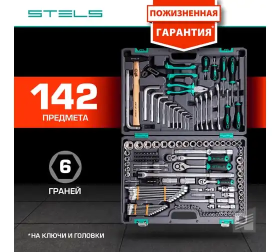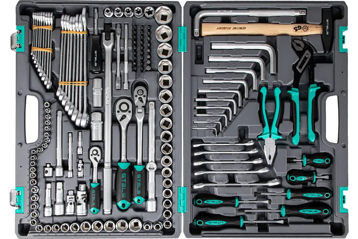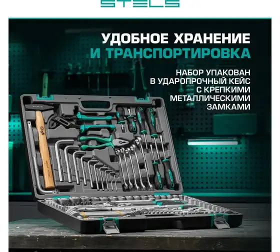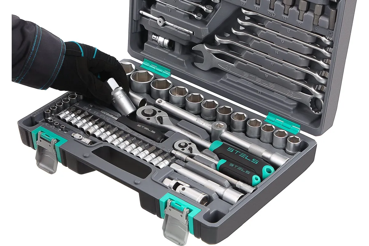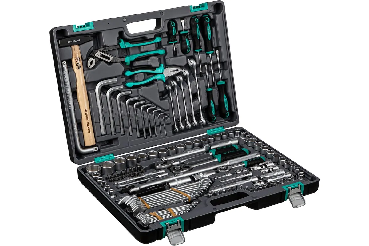 Набор инструментов Stels 14107 в пластиковом кейсе включает 142 предмета из стали CrV, с присоединительными размерами 1/2", 1/4" и 3/8", и предназначен для ремонта автомобилей в гараже или автосервисе. Может использоваться в домашних условиях. В комплект входят инструменты для выполнения широкого спектра слесарных работ. Набор упакован в ударопрочный кейс из жесткого пластика и с металлическими застежками, поэтому его удобно хранить и перевозить в багажнике автомашины.