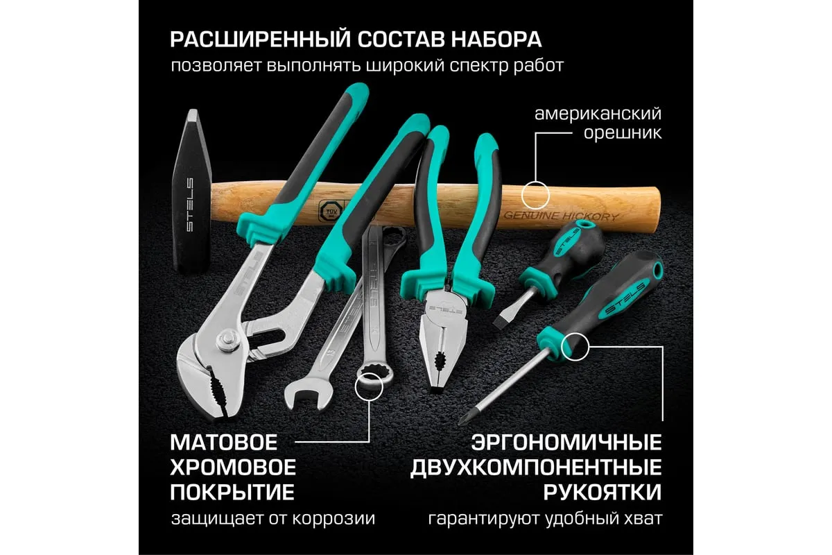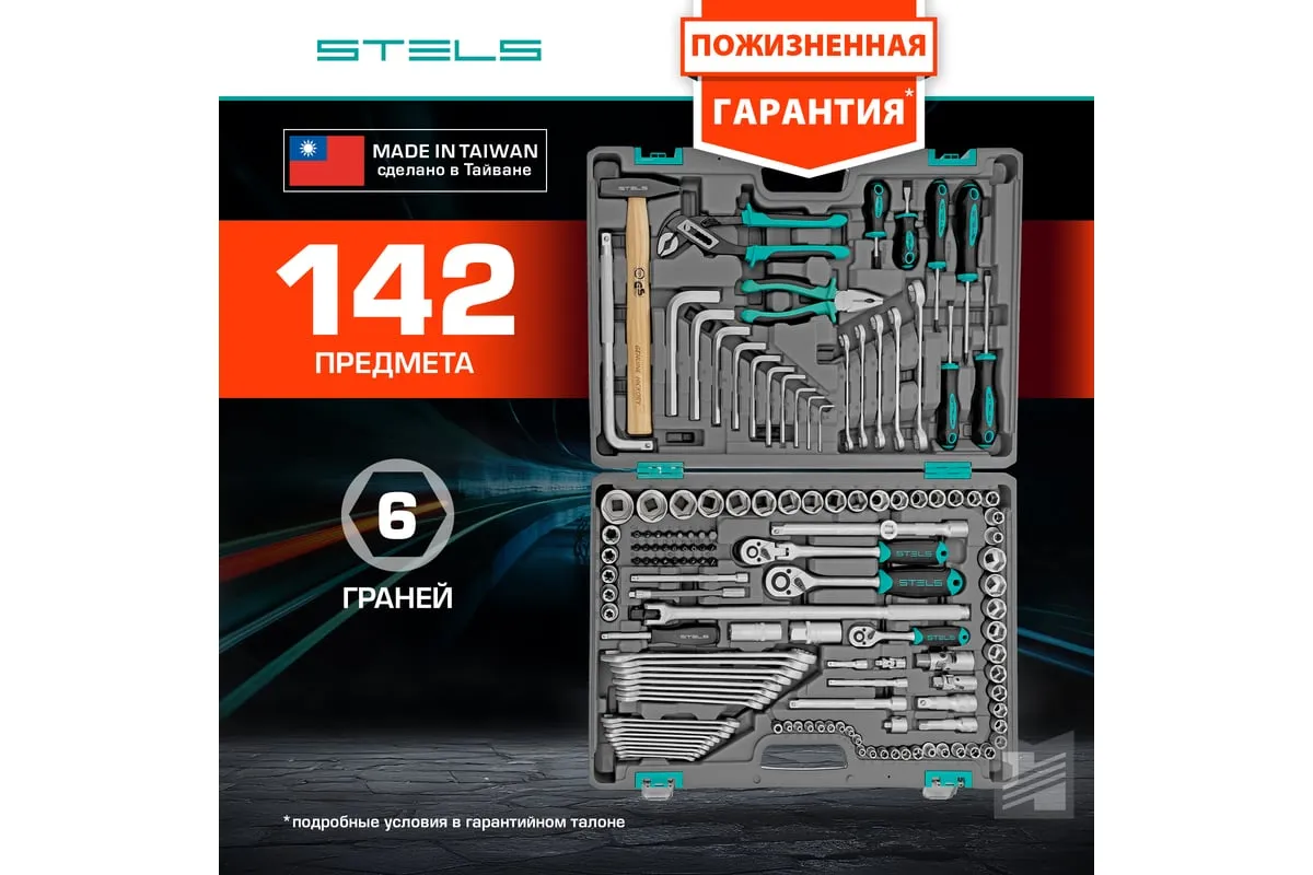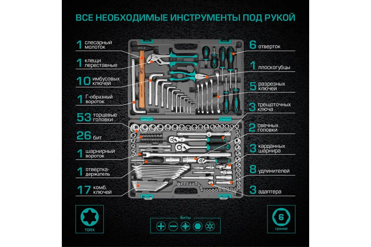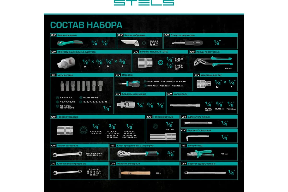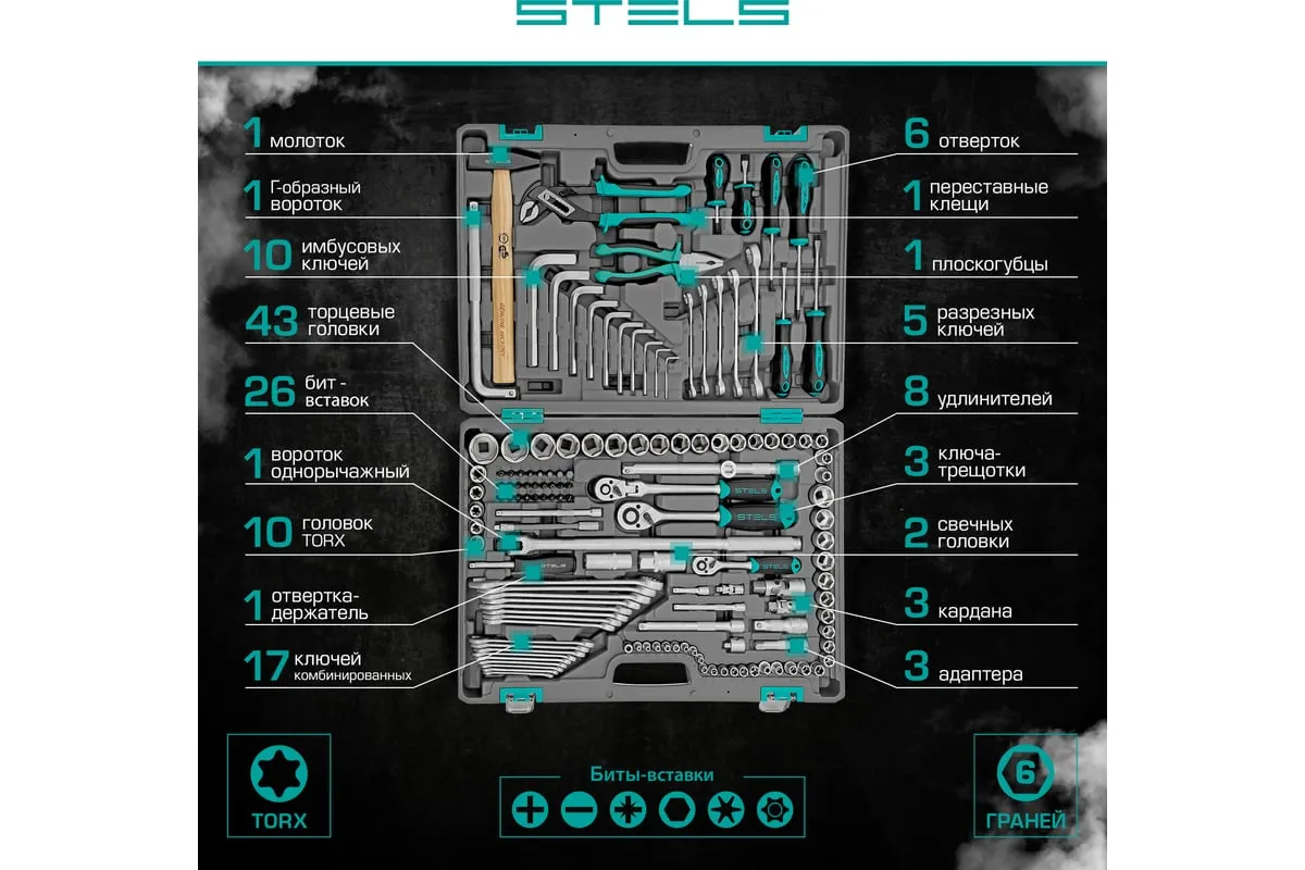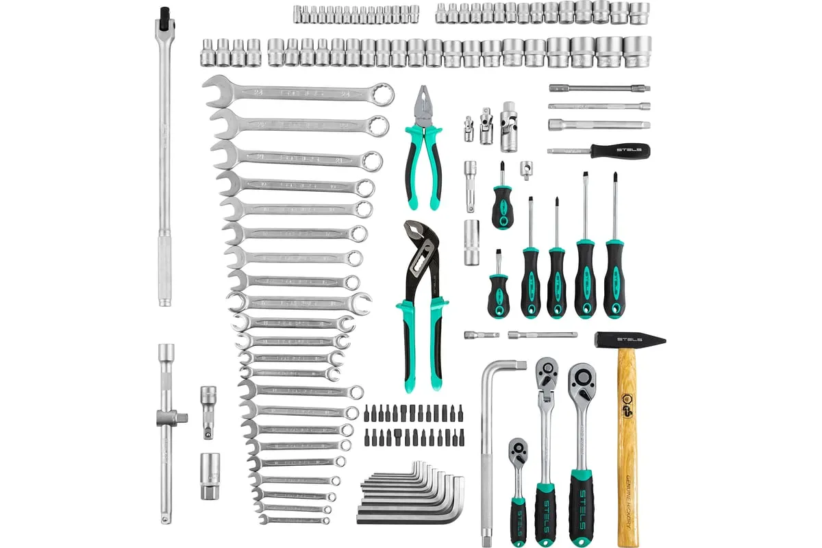 Набор инструментов Stels 14107 в пластиковом кейсе включает 142 предмета из стали CrV, с присоединительными размерами 1/2", 1/4" и 3/8", и предназначен для ремонта автомобилей в гараже или автосервисе. Может использоваться в домашних условиях. В комплект входят инструменты для выполнения широкого спектра слесарных работ. Набор упакован в ударопрочный кейс из жесткого пластика и с металлическими застежками, поэтому его удобно хранить и перевозить в багажнике автомашины.