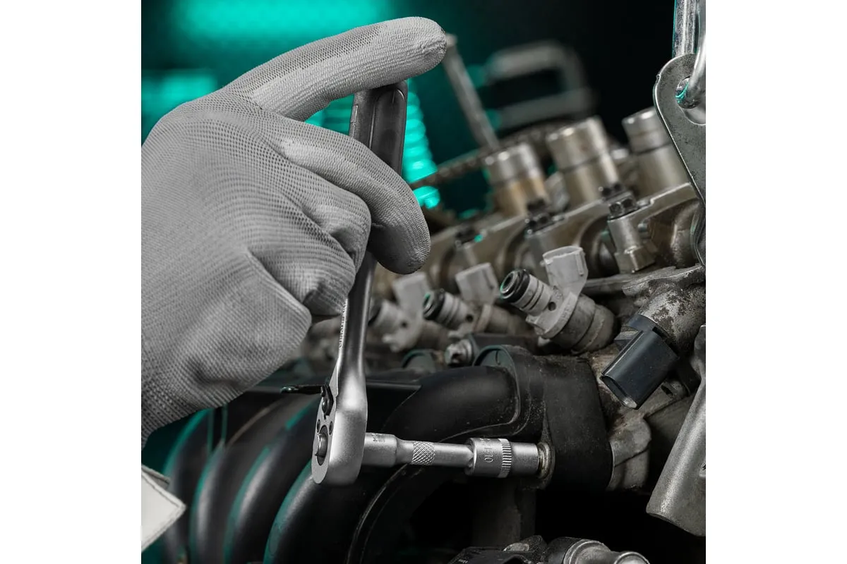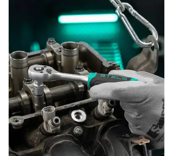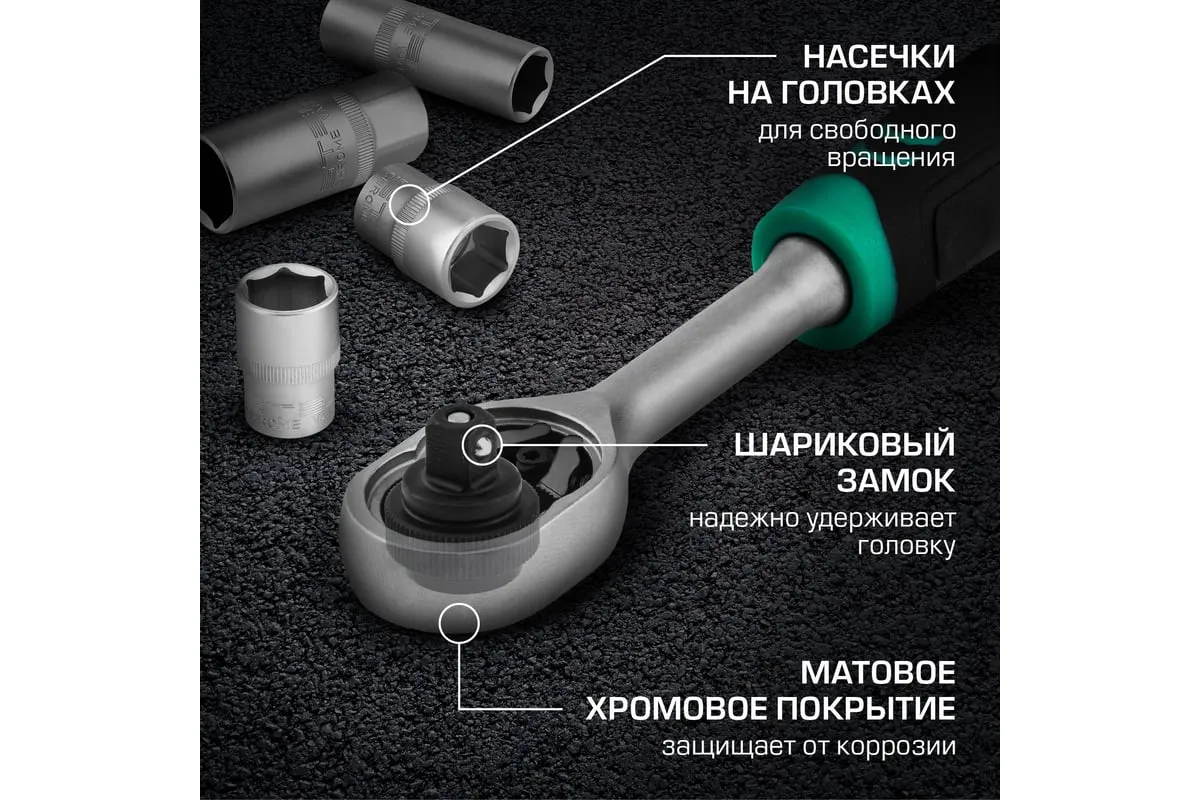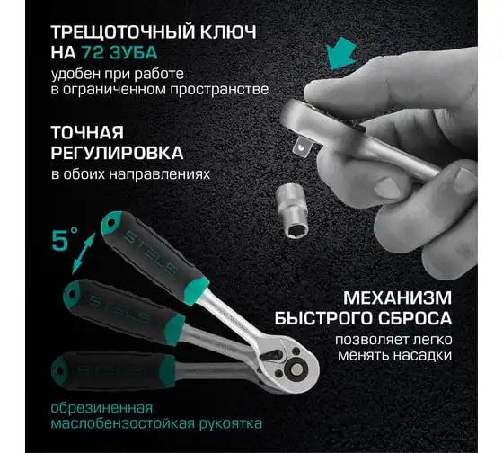 Дополнительно в комплекте предусмотрены трещоточные ключи с функцией быстрого сброса вставки и реверсивным механизмом. Трещотки имеют 72 зуба, шаг зуба - 5 градусов.