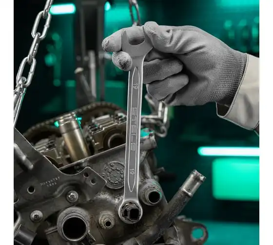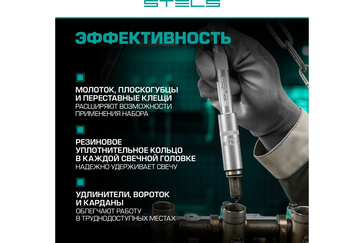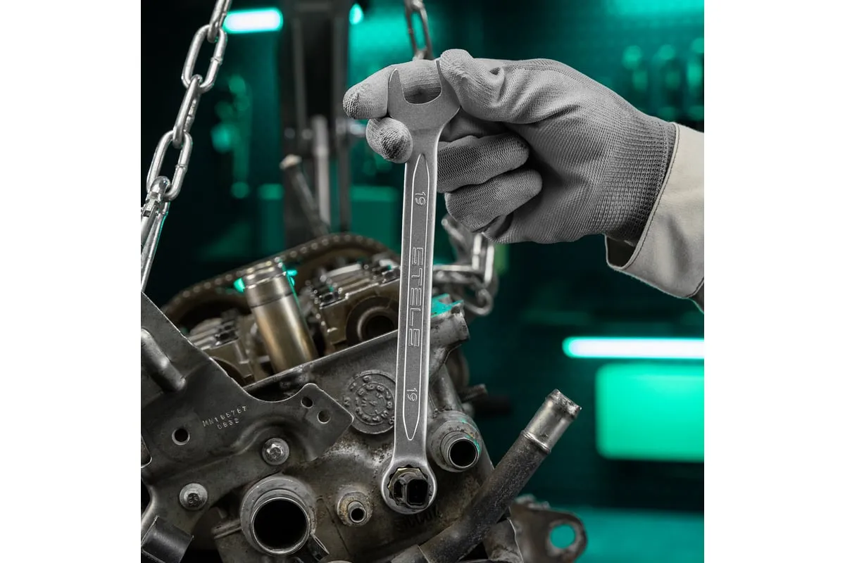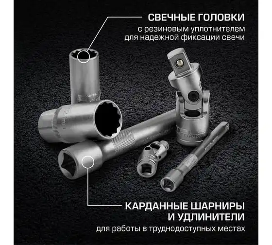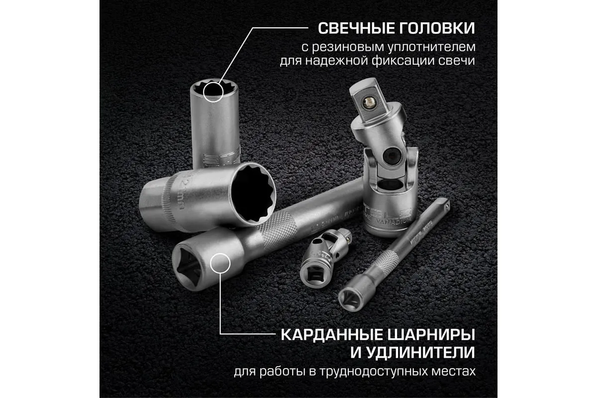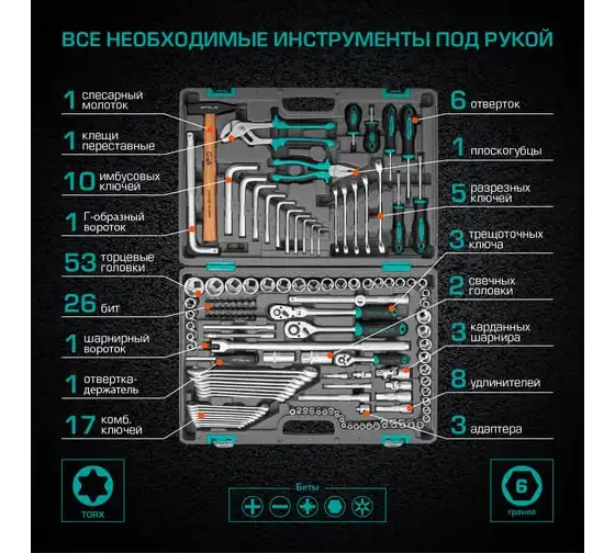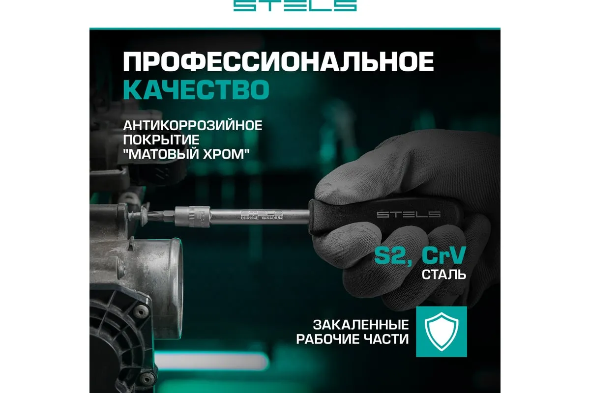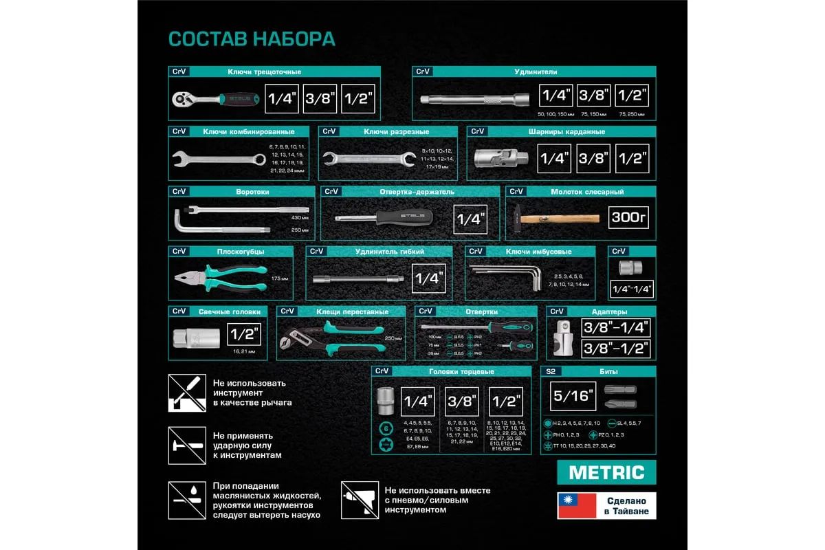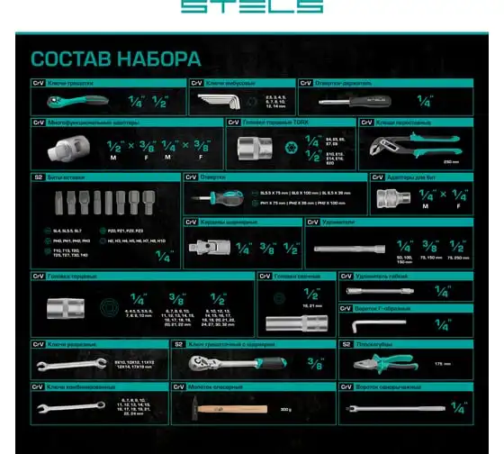 Торцевые головки и комбинированные ключи выполнены из хромованадиевой стали, а биты, биты-вставки и отвертки - из стали S2.